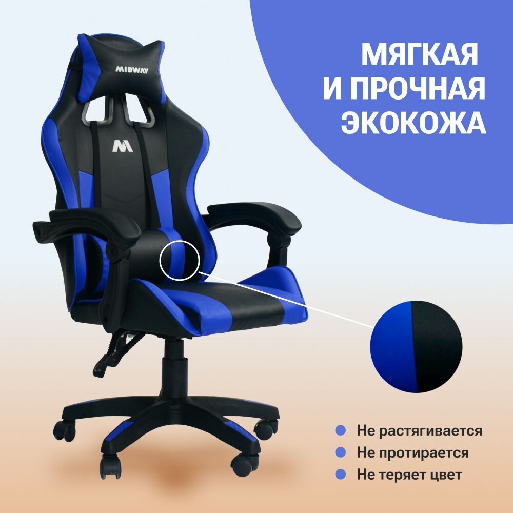 Компьютерное игровое кресло на колёсиках MIDWAY Axe, синий (эргономичное, с обивкой из экокожи) информация: