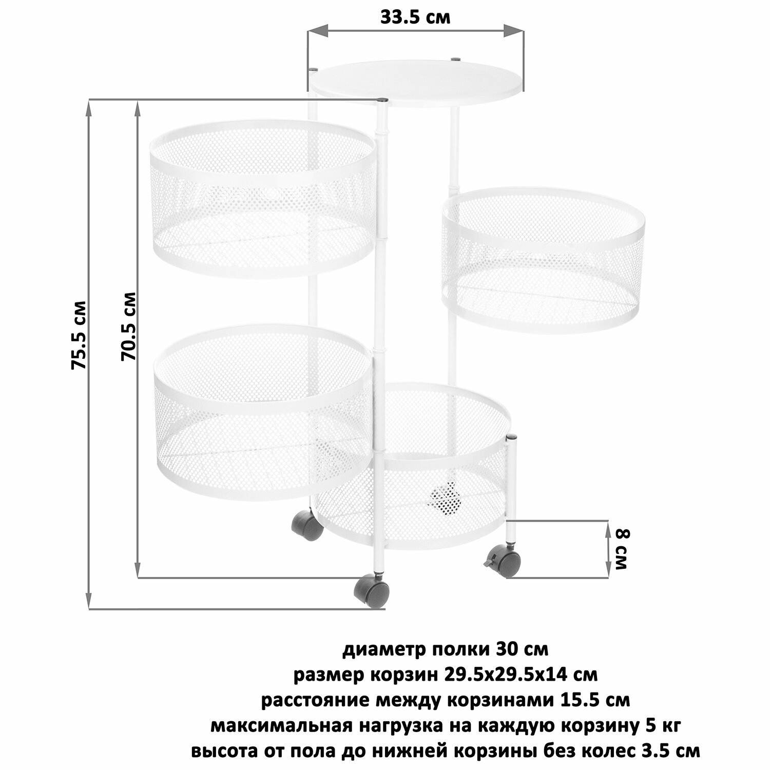 | Дополнительная информация | Этажерка 4-х ярусная на колесиках "Белая" 33,5х32х75,5 см, размер этажерки без колесиков 33,5х32х70,5 см, на 4-х колесиках, 2 колесика с фиксаторами, диаметр полки 30 см, размер корзин 29,5х29,5х14 см, расстояние между корзинами 15,5 см, высота от пола до нижней корзины без колес - 3,5 см, с колесами - 8 см, максимальная нагрузка на каждую корзину 5 кг, металлическая |