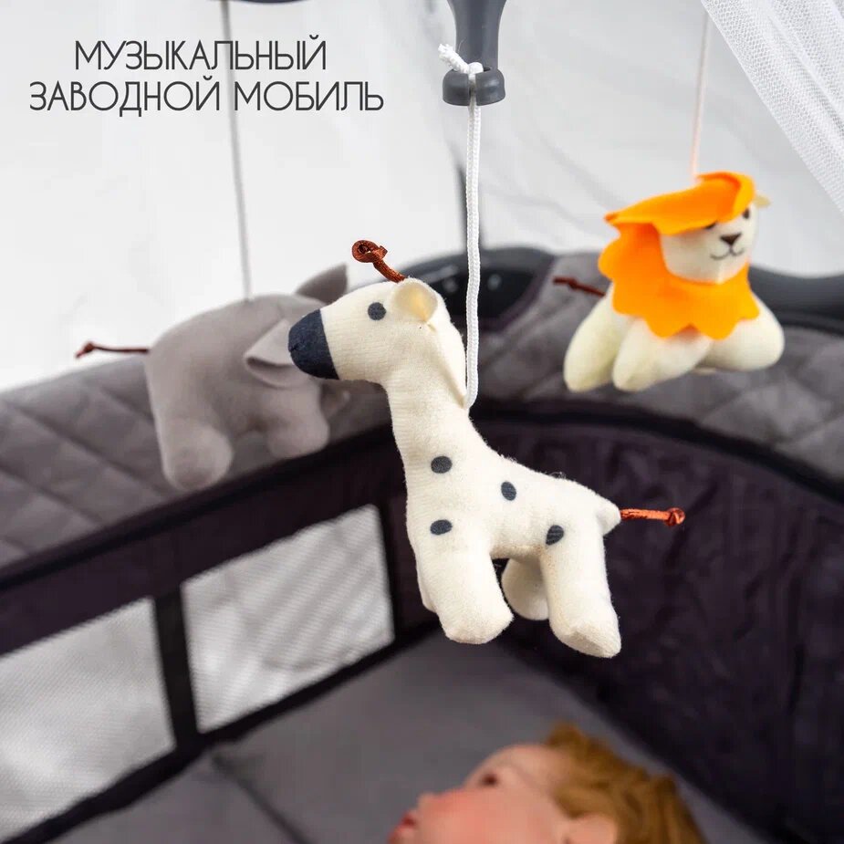 | Комплектация | Кроватка-манеж Пеленальный столик Держатель балдахина Балдахин Музыкальный мобильный Игрушки на мобильный - 3 шт Ремешок для фиксации Колесики - 4 шт Органайзер для бутылочек и подгузников Сумка для транспортировки Инструкция |
