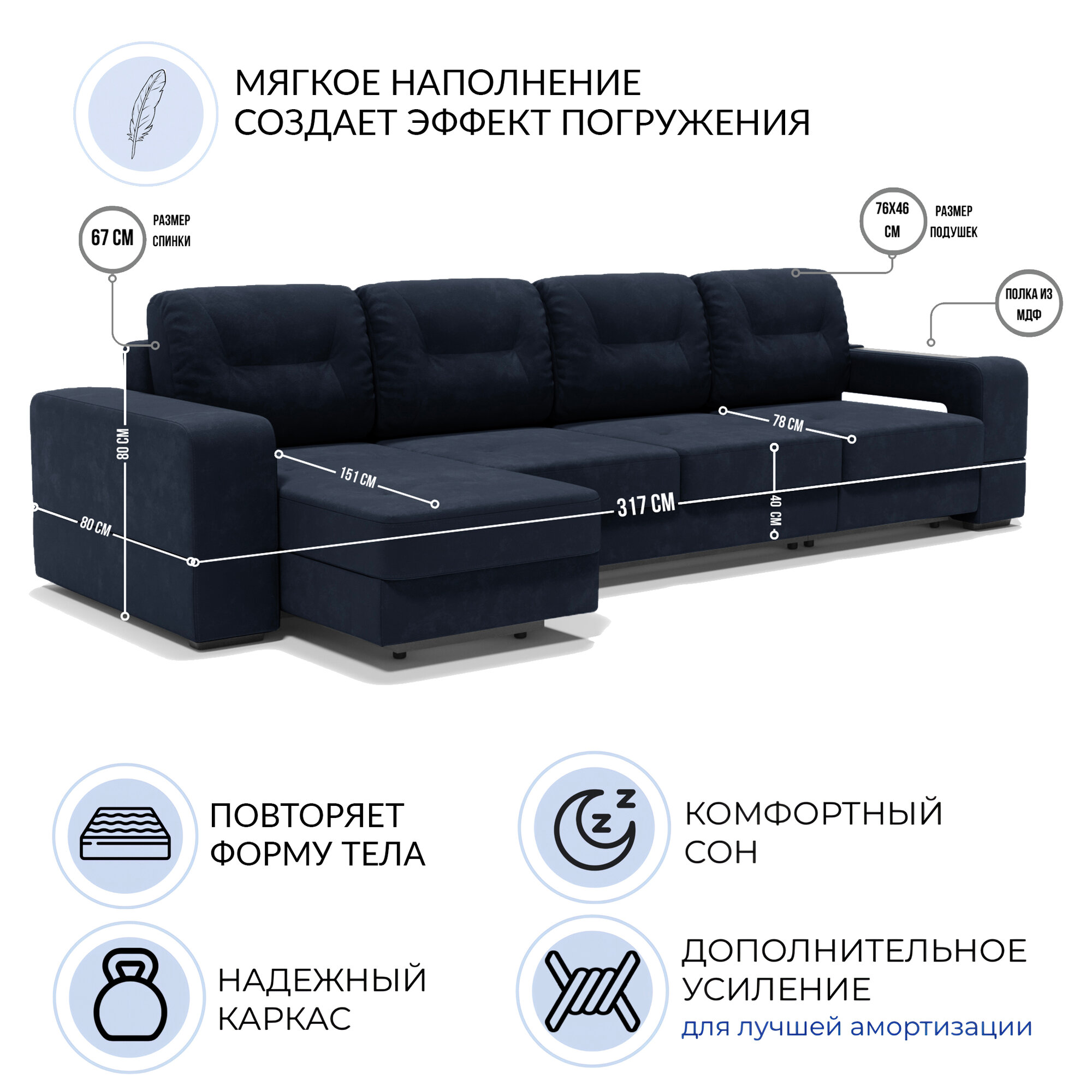 Отзывы на Угловой диван в гостиную «Барон 2 с оттоманкой», раскладной диван трансформер на механизме «тик-так», 317х151х90см, синий