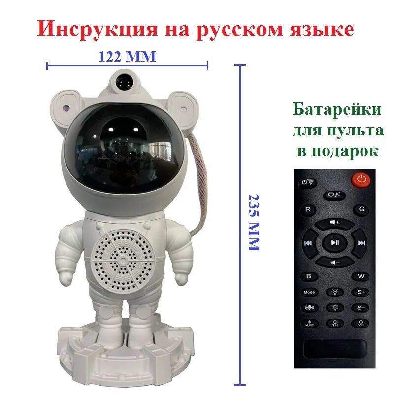 | Комплектация | - Звездный проектор-астронавт - Пульт дистанционного управления - Батарейки ААА - 2 шт - Кабель питания - 1,5 м - Документация на русском языке |