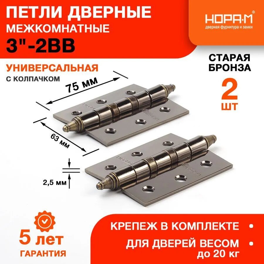 10 цен на Петли дверные 2 шт. Нора-М 3"-2ВВ-CHP универсальные (75х63х2,5) - Старая бронза
