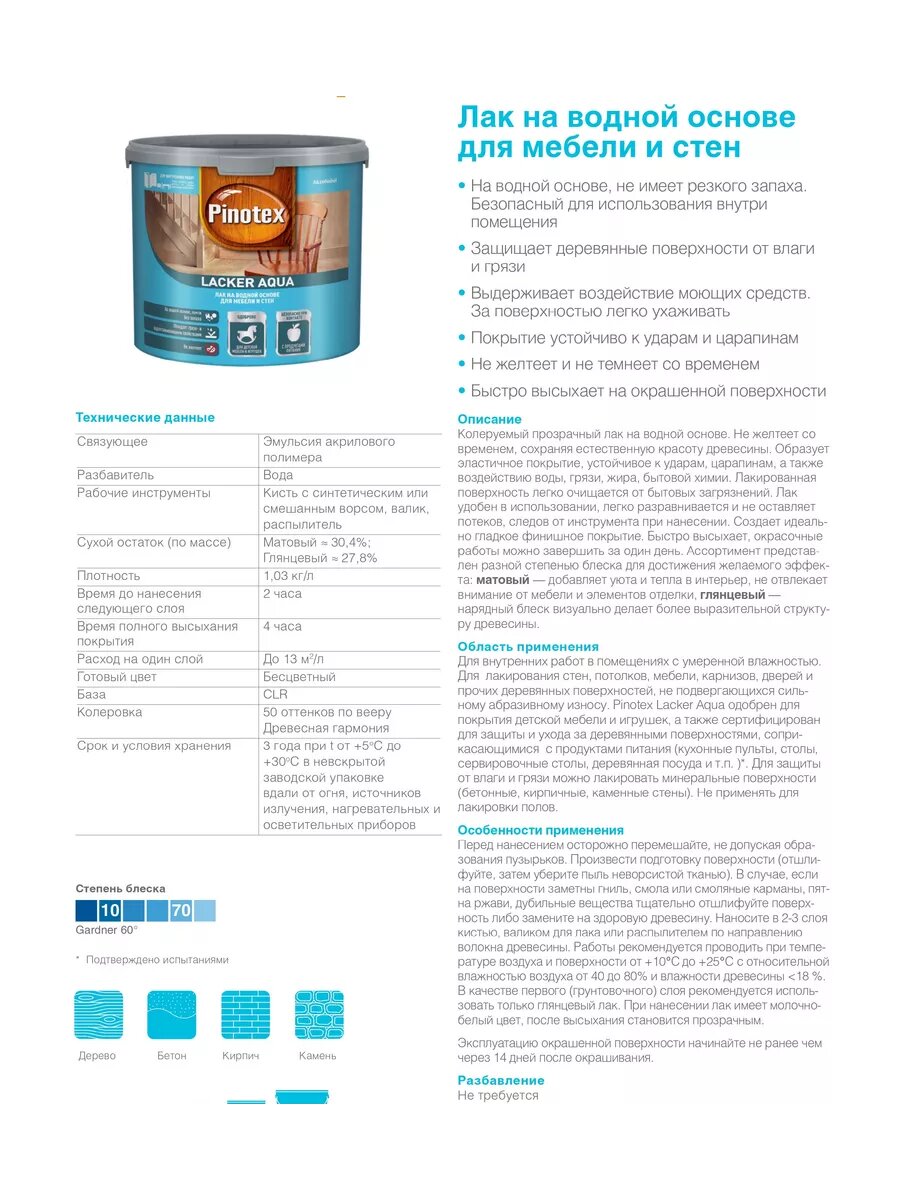 Лак PINOTEX LACKER AQUA 10 матовый 1 л информация: