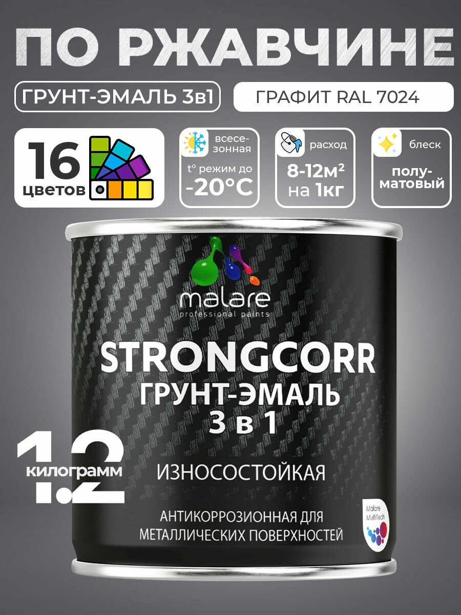 Грунт-Эмаль Malare 3 в 1 для металлических поверхностей, краска для металла, износостойкая, полуматовая, RAL 7024, графитово-серый(темный), 1.2 кг. информация: