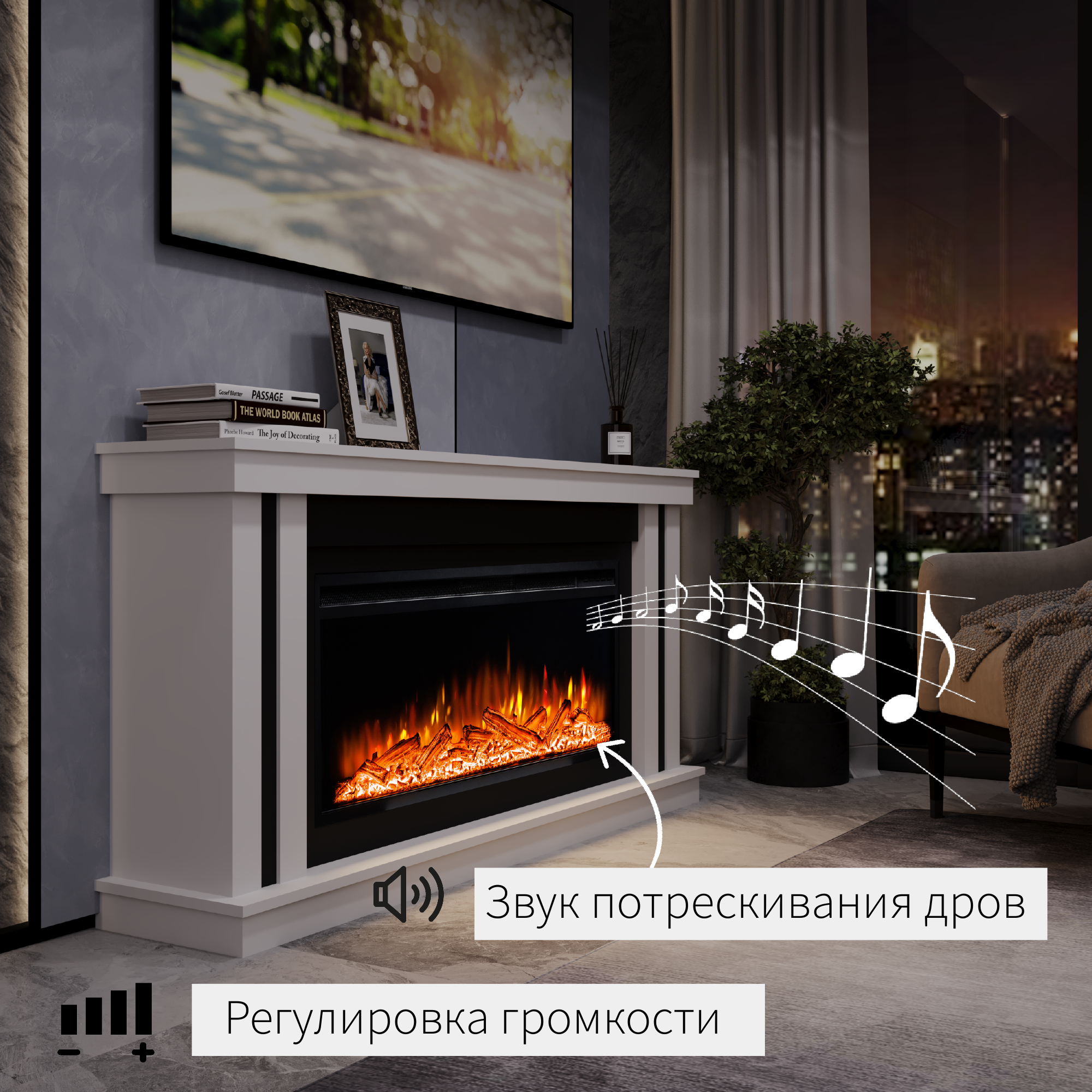 Камин электрический ELEKAM SILVER белый с очагом с пультом, обогревом и звуком потрескивания дров (Электрокамин)