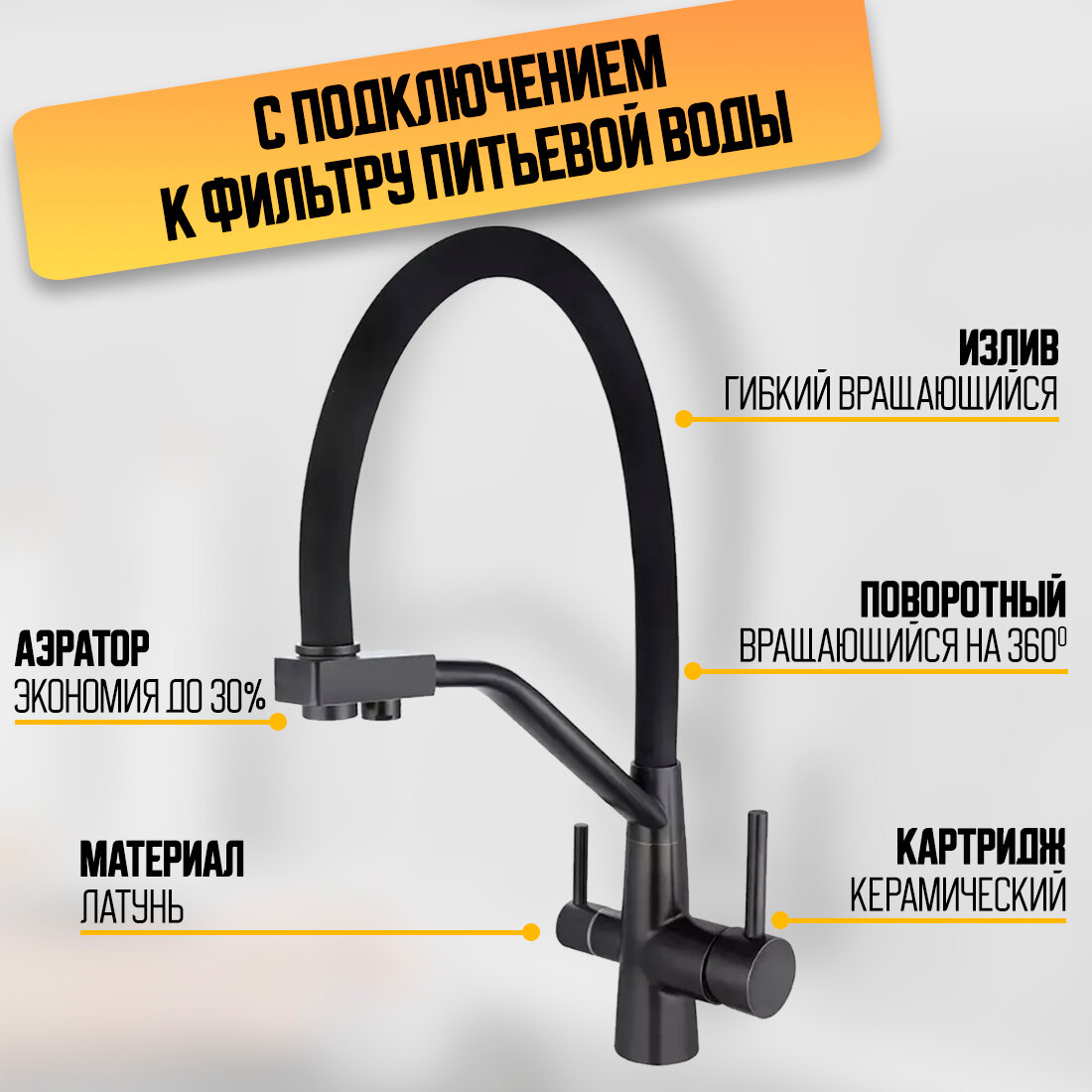 Смеситель (кран) для кухни с фильтром для питьевой воды, для раковины на кухню с гибким изливом, Trigor черный белый 6 400 ₽