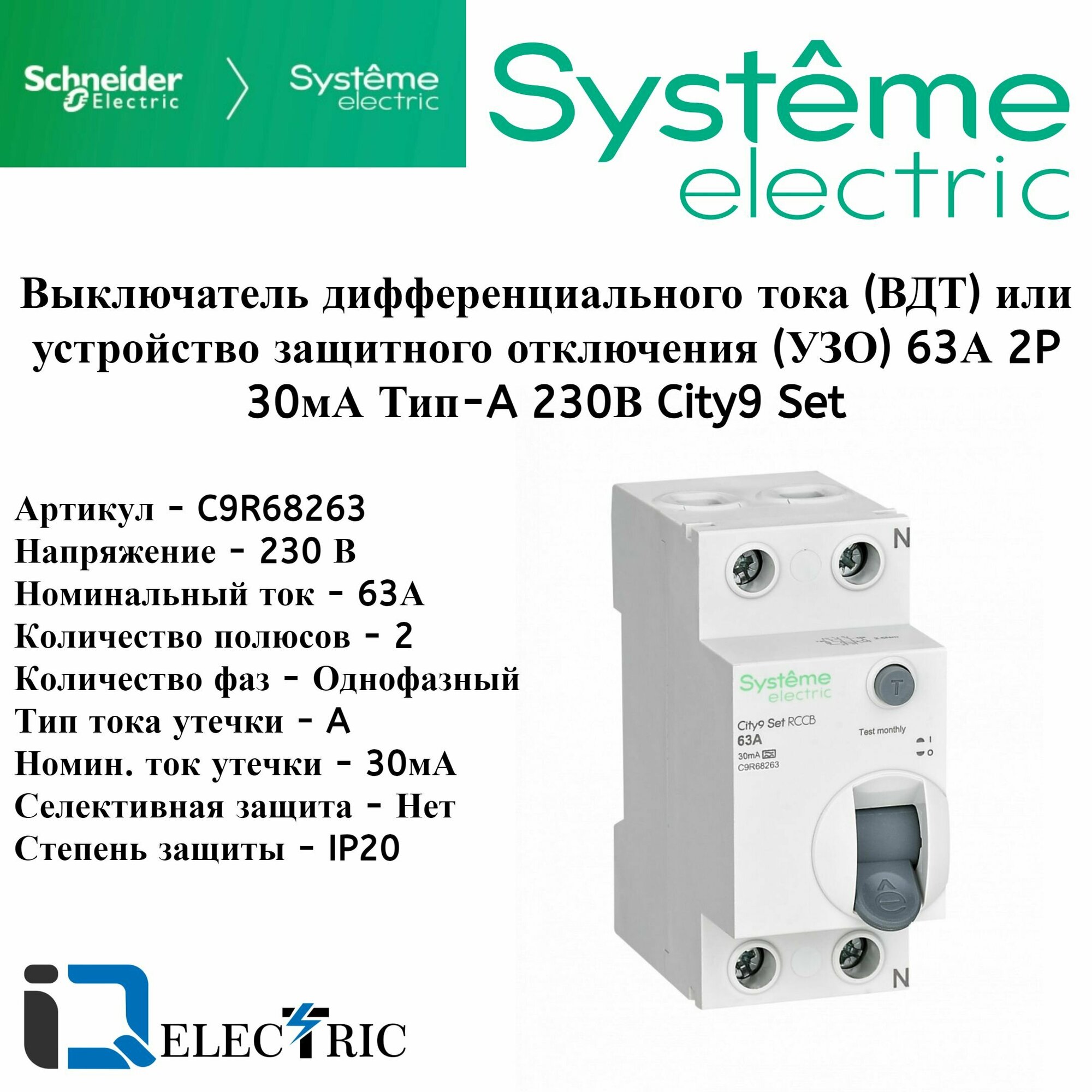 Устройство защитного отключения (УЗО) 63А 2P 30мА Тип-A 230В City9 Set Systeme Electric C9R68263 информация: