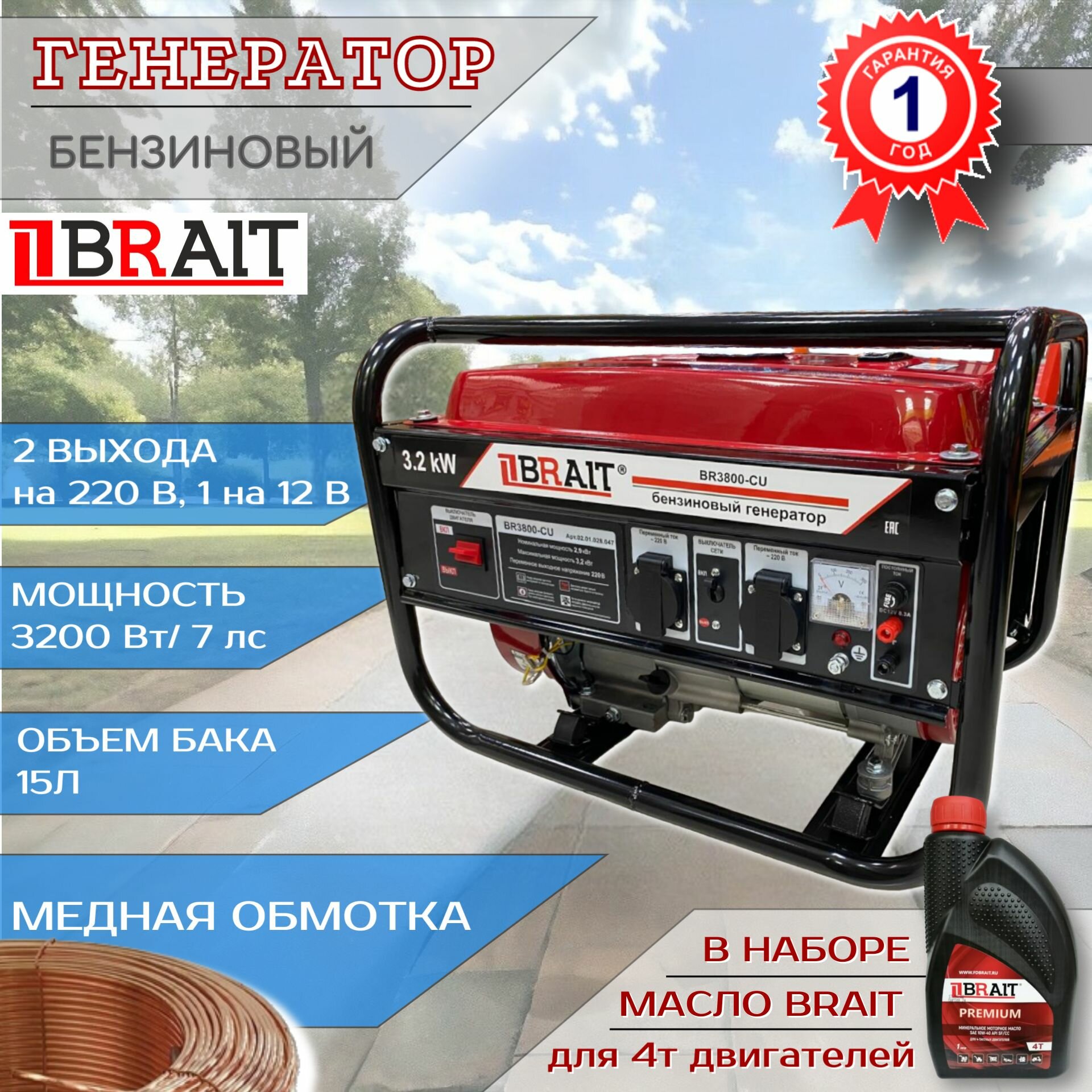 Генератор бензиновый BRAIT BR3800-CU / бензогенератор 3,2 кВт / генератор для рыбалки, туризма, с медной обмоткой + масло 4 т в наборе информация: