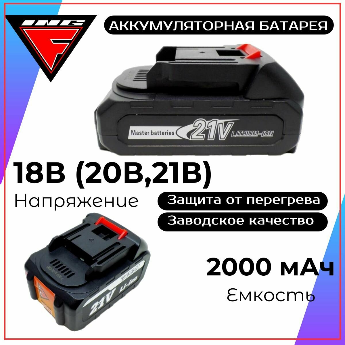 Аккумулятор INGF, для инструмента, Li-Ion, 18В, 1,5Ач, 5с, слайдерная конструкция 1 800 ₽