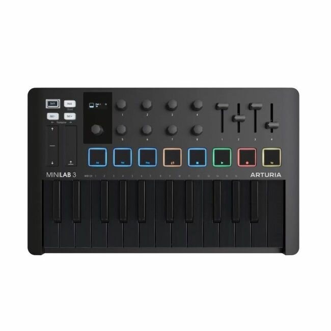 10 цен на Миди-клавиатура Arturia MIDI клавиатура [MiniLAB 3 Deep Black] 25 клавиш, 8 энкодеров, 8 RGB пэдов, 8 фейдеров, дисплей, сенсорные регуляторы