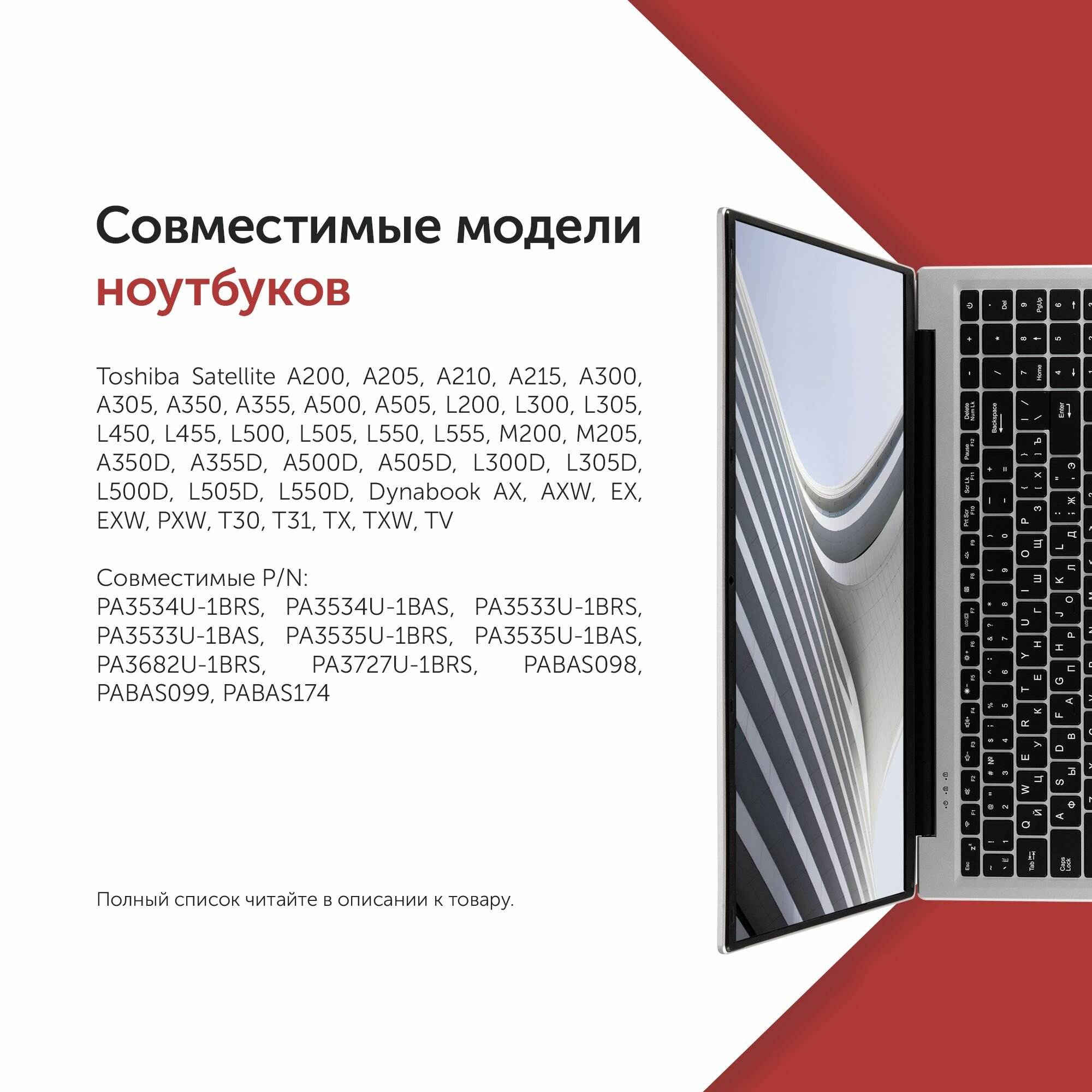 | Список совместимых устройств | Toshiba Satellite A200, A205, A210, A215, A300, A305, A350, A355, A500, A505, L200, L300, L305, L450, L455, L500, L505, L550, L555, M200, M205, A350D, A355D, A500D, A505D, L300D, L305D, L500D, L505D, L550D, Dynabook AX, AXW, EX, EXW, PXW, T30, T31, TX, TXW, TV. P/N: PA3534U-1BRS, PA3534U-1BAS, PA3533U-1BRS, PA3533U-1BAS, PA3535U-1BRS, PA3535U-1BAS, PA3682U-1BRS, PA3727U-1BRS, PABAS098, PABAS099, PABAS174. |