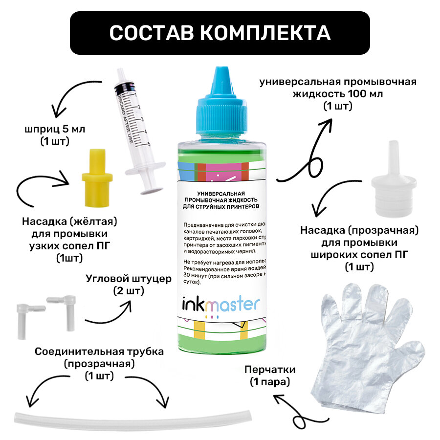 Комплект для промывки печатающих головок в Canon и HP (инструменты + промывочная жидкость 100 мл) Inkmaster информация: