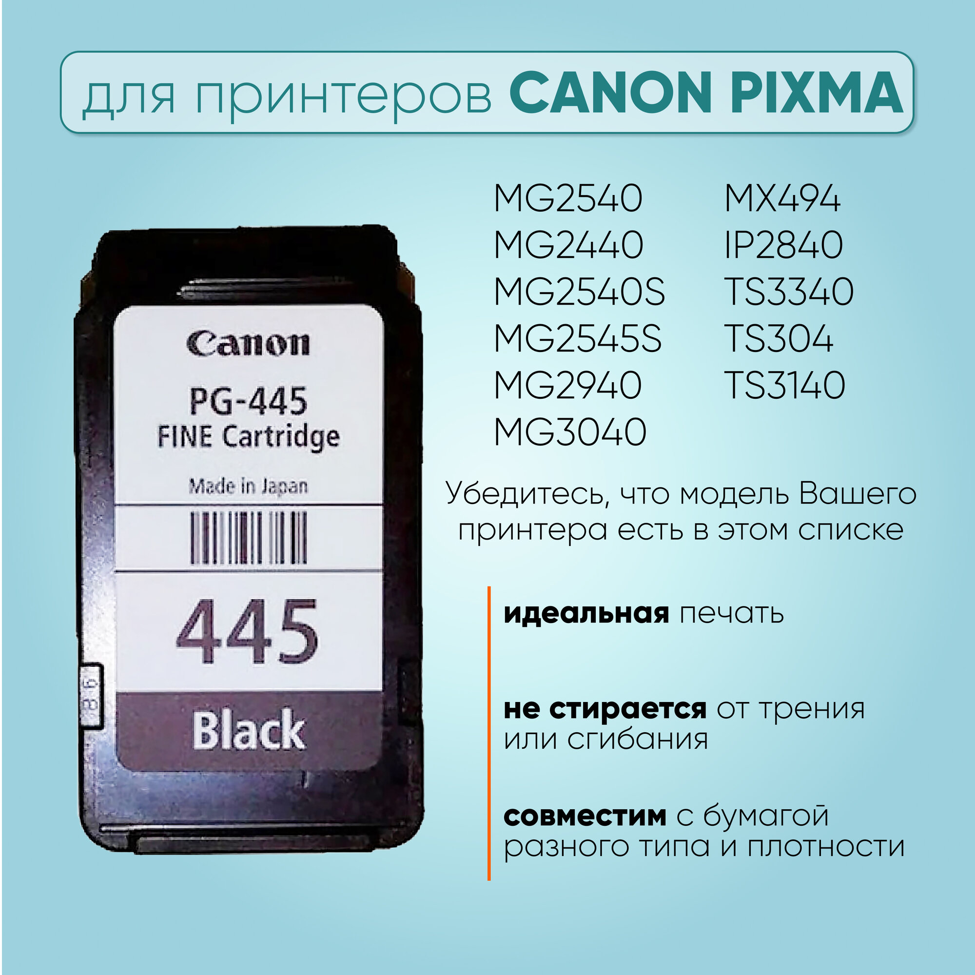 | Модель совместимого принтера | Canon Pixma MG3040 / Canon Pixma MX494 / Canon PIXMA TS304 / Canon Pixma TS3140 / Canon PIXMA TS3340 / Canon Pixma iP2840 / Canon Pixma MG2440 / Canon Pixma MG2540 / Canon Pixma MG2940 |