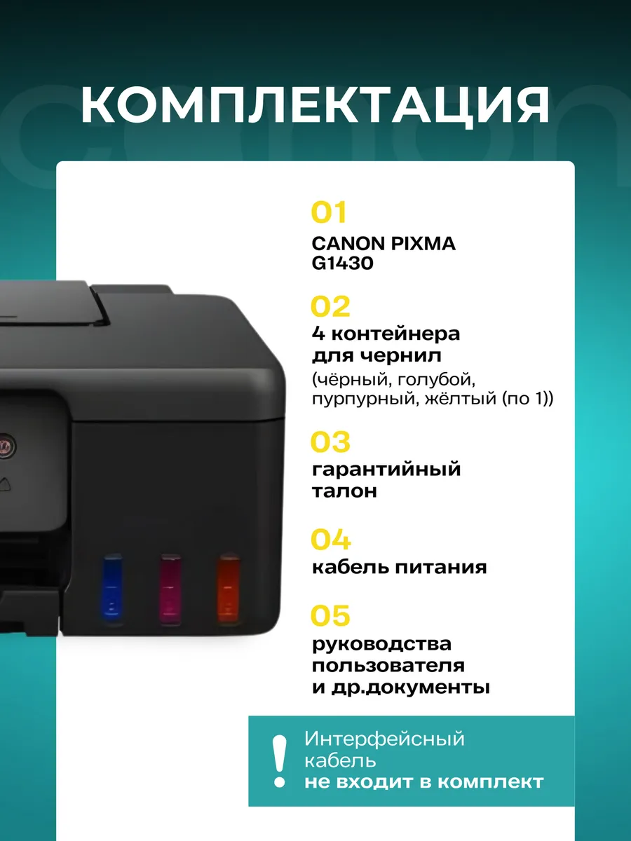 | Комплектация | Струйный принтер PIXMA G1430 с пополняемыми емкостями для чернил, 4 контейнера для чернил (1 черный и 1 голубой / пурпурный / желтый), Кабель питания, Руководства пользователя и другие документы. Интерфейсный кабель не входит в комплектацию. |