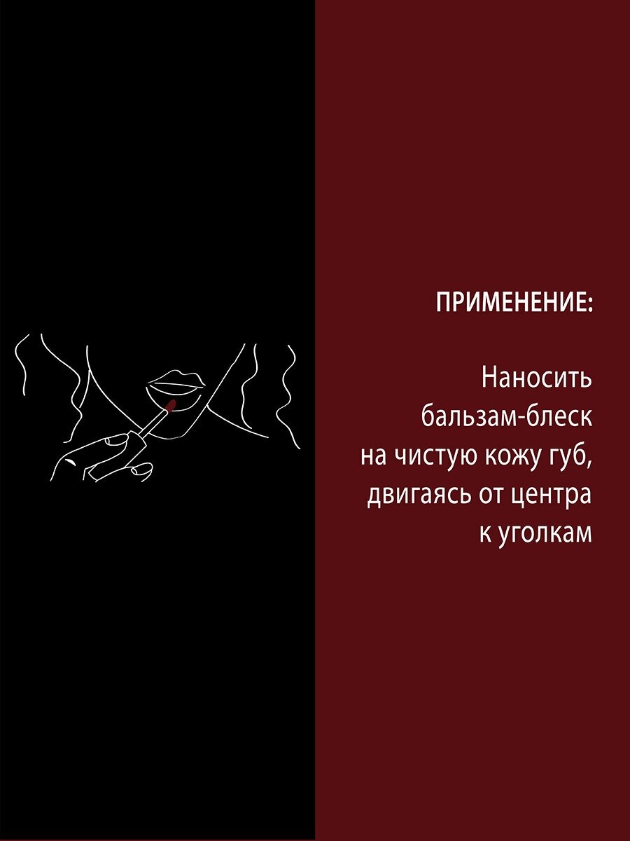 | Способ применения | Наносить бальзам-блеск на чистую кожу губ, двигаясь от центра к уголкам. |