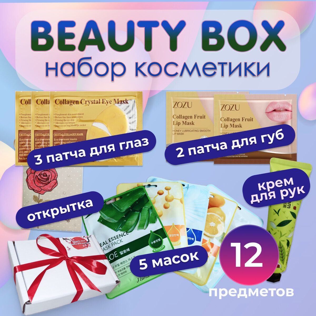 | Состав набора | крем для рук / маска для лица / открытка / патчи для глаз / патчи для губ |