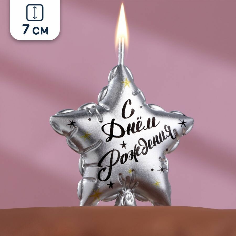Свеча для торта Звезда, С Днем рождения, серебристая, 12,5 см