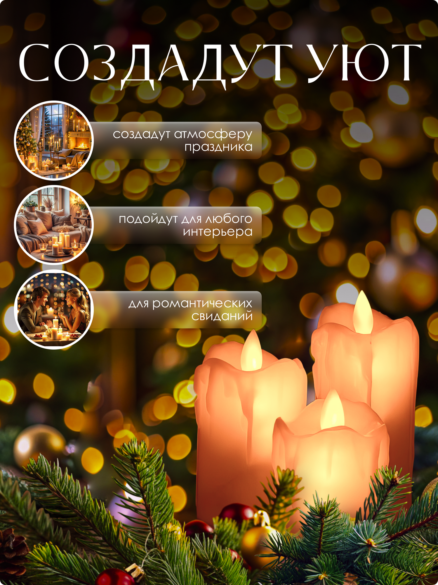 Светодиодные свечи для интерьера, на батарейках, набор 3 шт. информация: