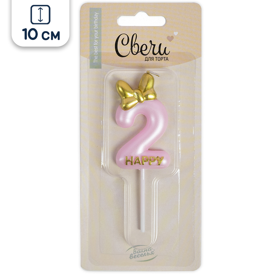 Свеча для торта парафиновая Riota Золотой бант, Цифра 2, розовый, 10 см, 1 шт. информация: