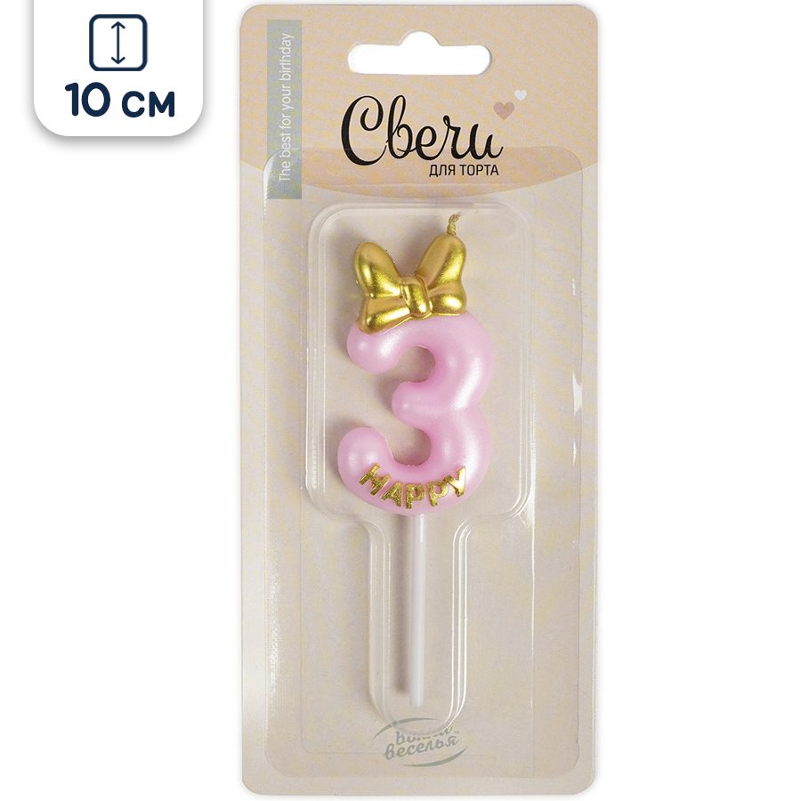 Свеча для торта парафиновая Riota Золотой бант, Цифра 3, розовый, 10 см, 1 шт. информация: