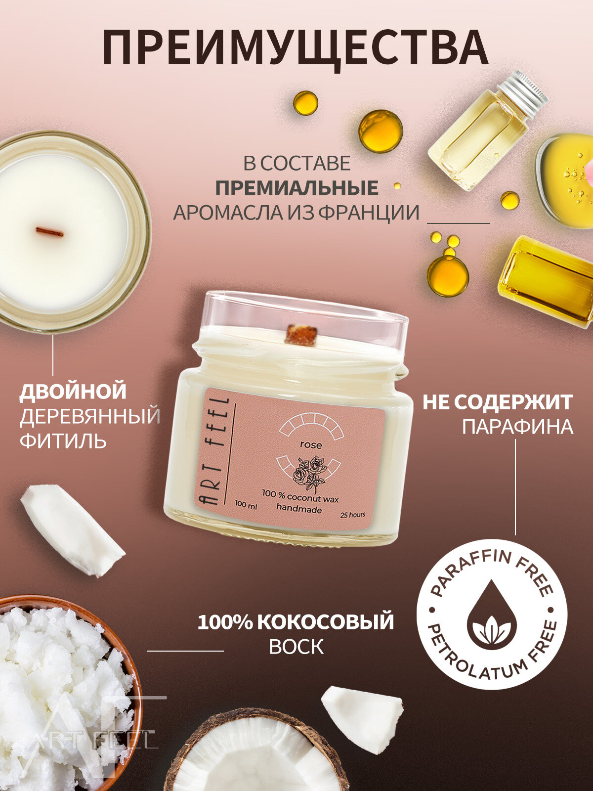 | Комплектация | Ароматическая свеча из кокосового воска с деревянным потрескивающим фитилем от бренда ART FEEL, аромасвеча в стеклянном стакане с крышкой |