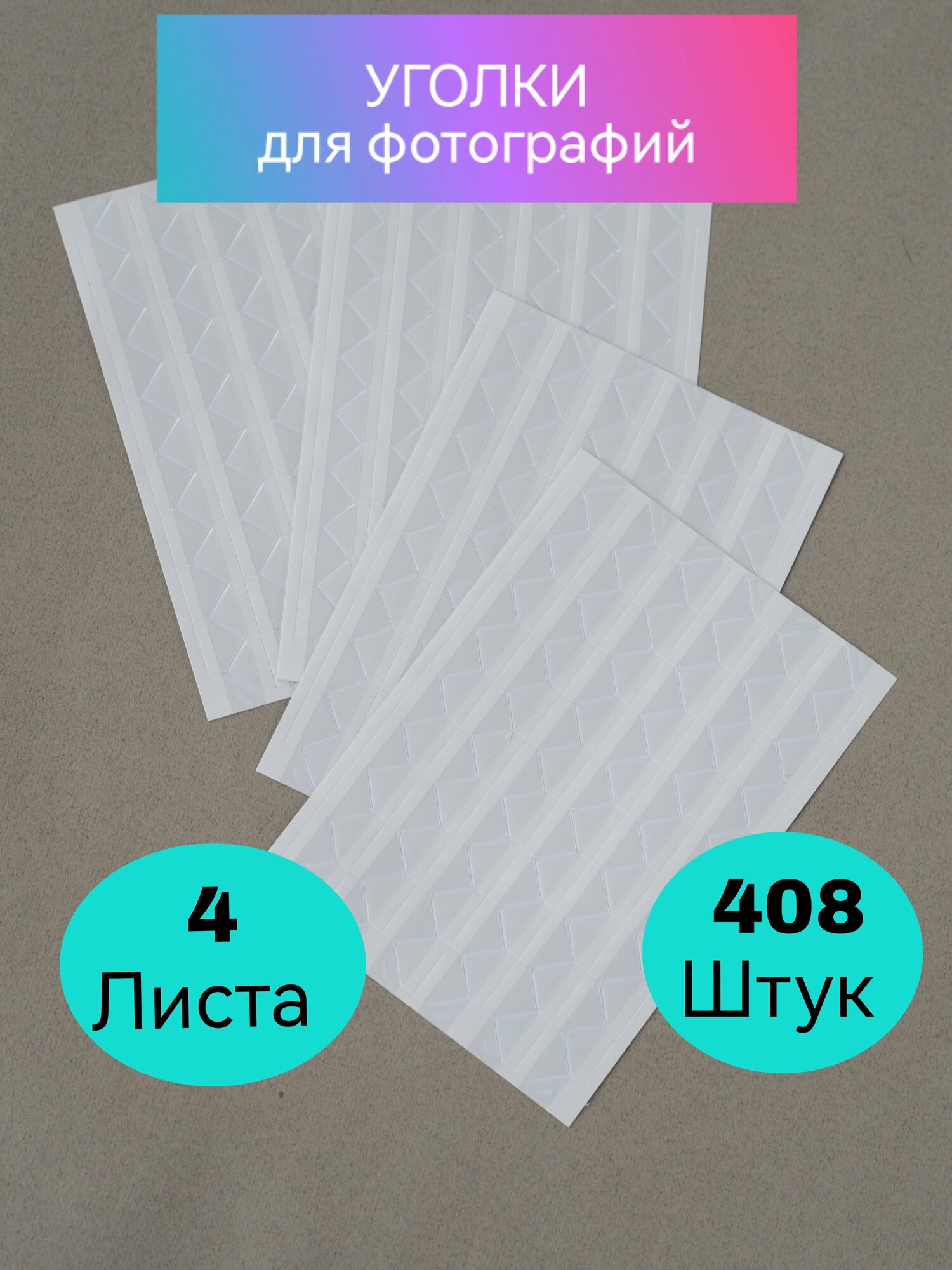 Прозрачные уголки для фотографий самоклеящиеся в фотоальбом, Уголки для фотоальбома свадебного или детского 408 шт, Уголки для фото информация: