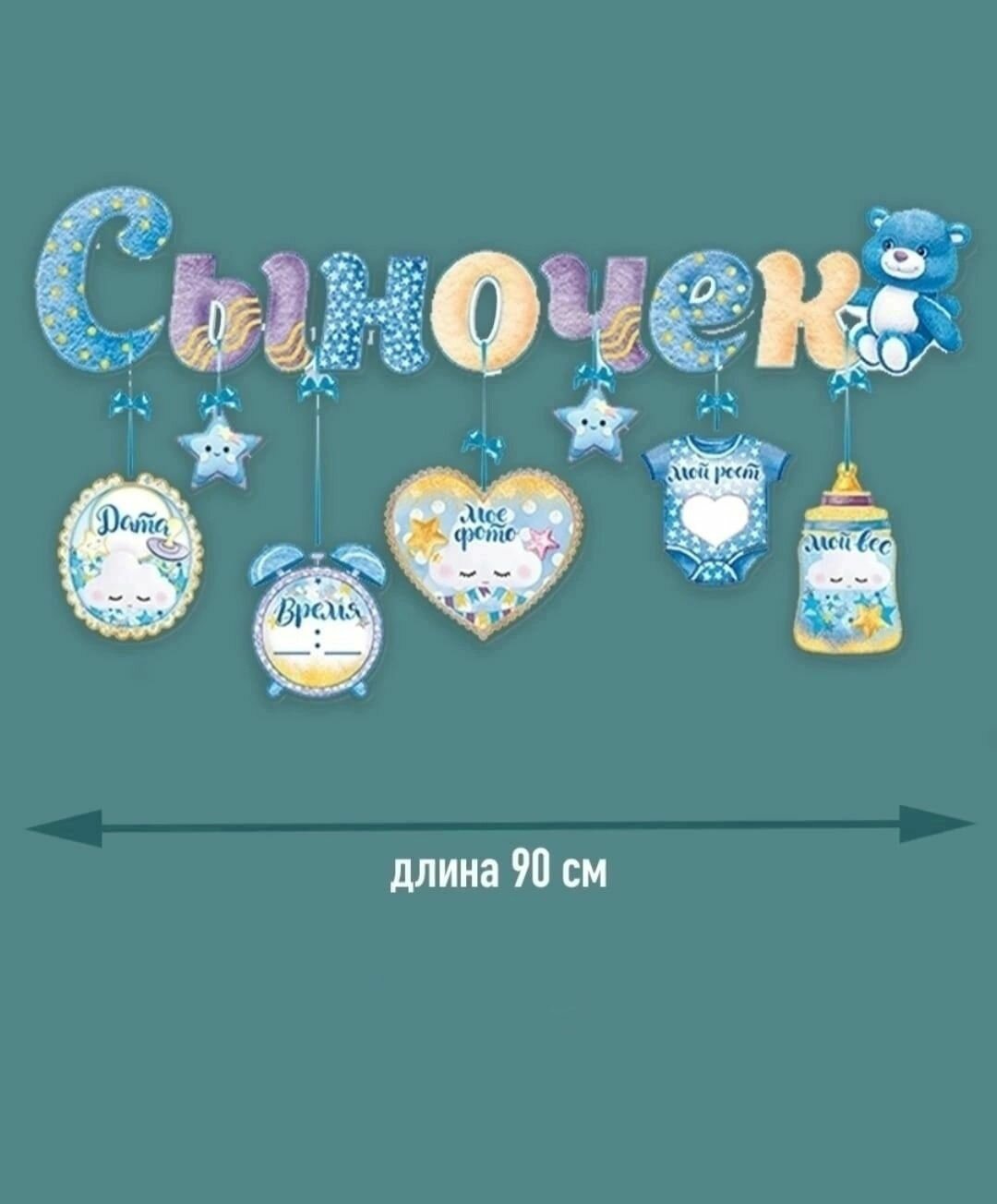 | Комплектация | Гирлянда-буквы с подвесками "Сыночек", 90см, 1шт в упаковке |