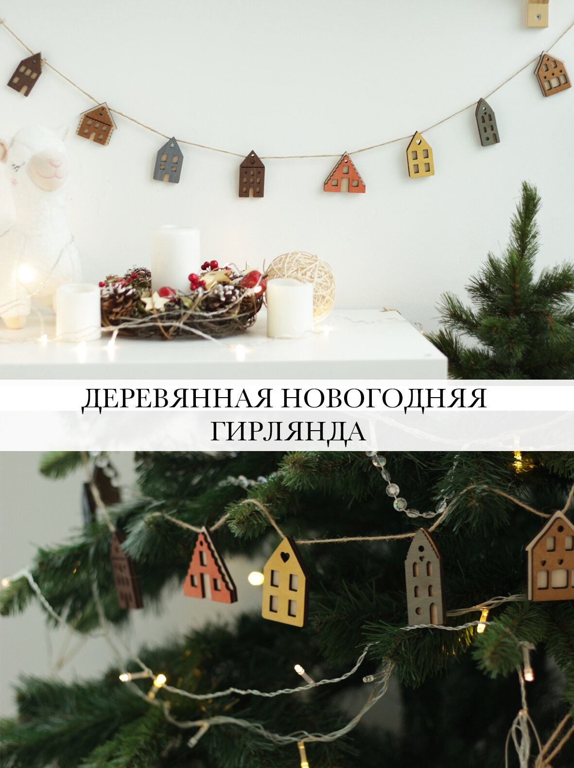 Гирлянда Домики новогодняя деревянная, украшение на елку домики деревянные, новогодняя игрушка на елку информация: