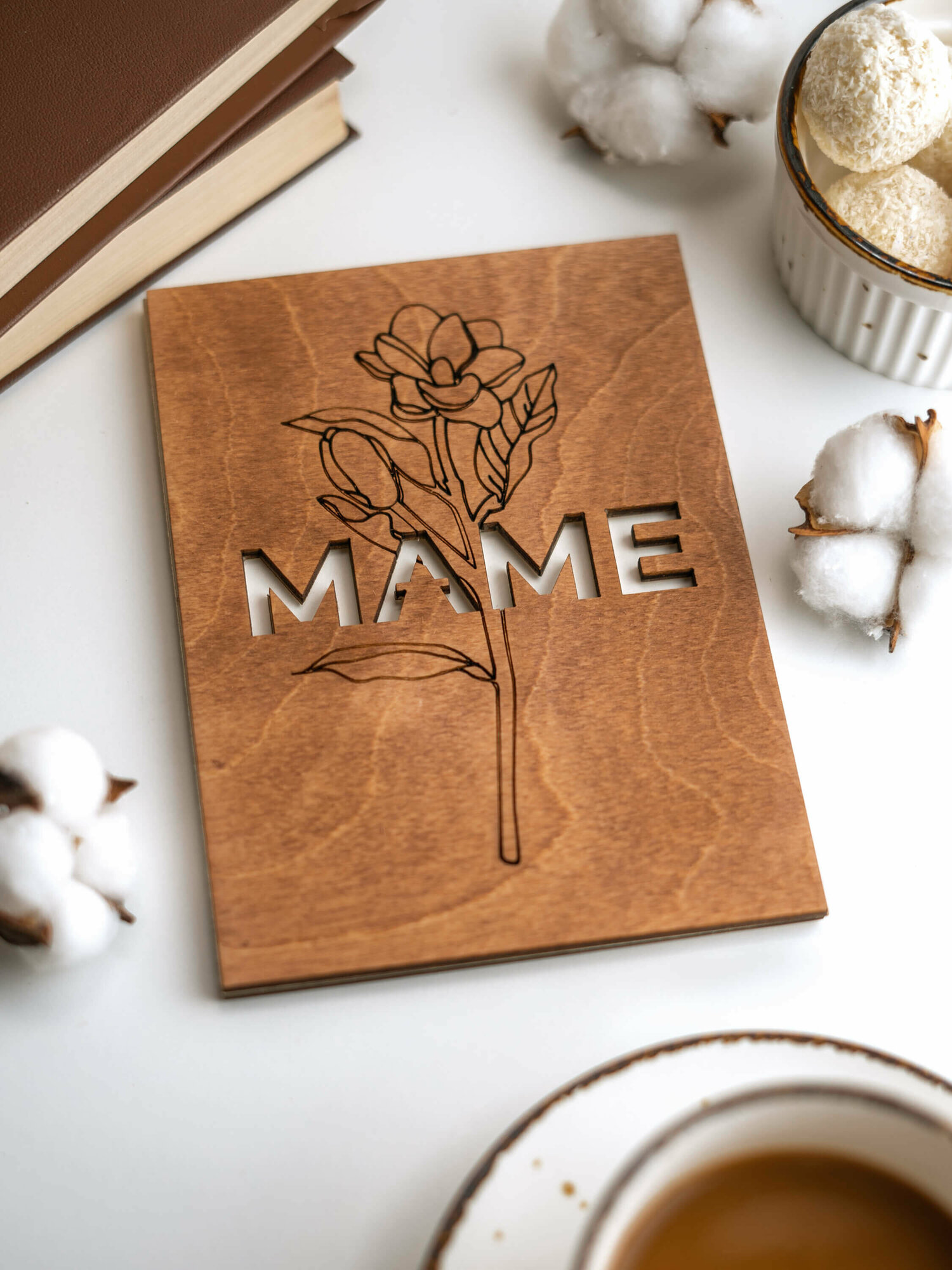 | Подробная комплектация | Деревянная открытка Маме без надписи внутри |