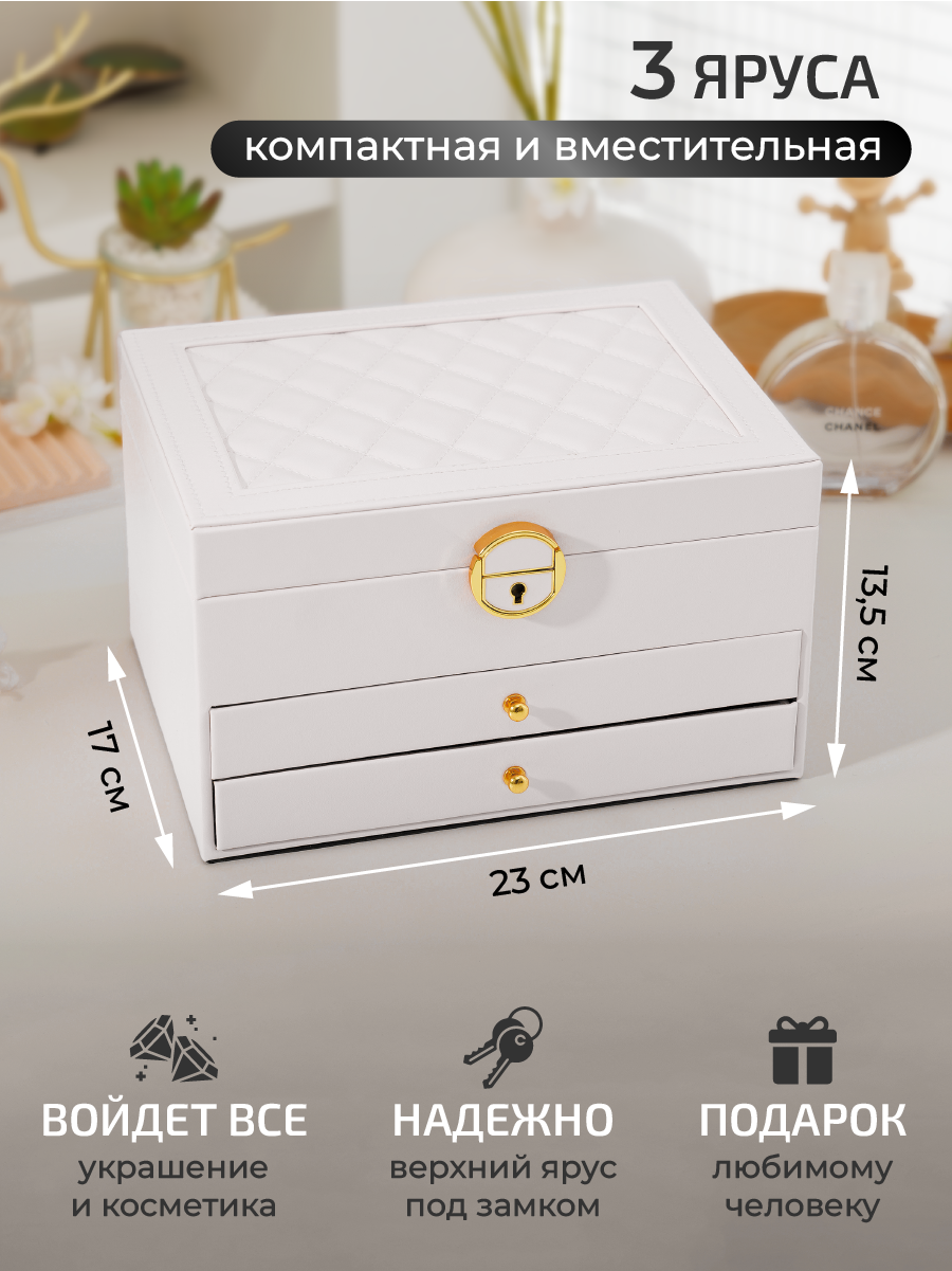 Шкатулка для украшений WELHOME 3-х ярусная большая шкатулка с замком, белая информация: