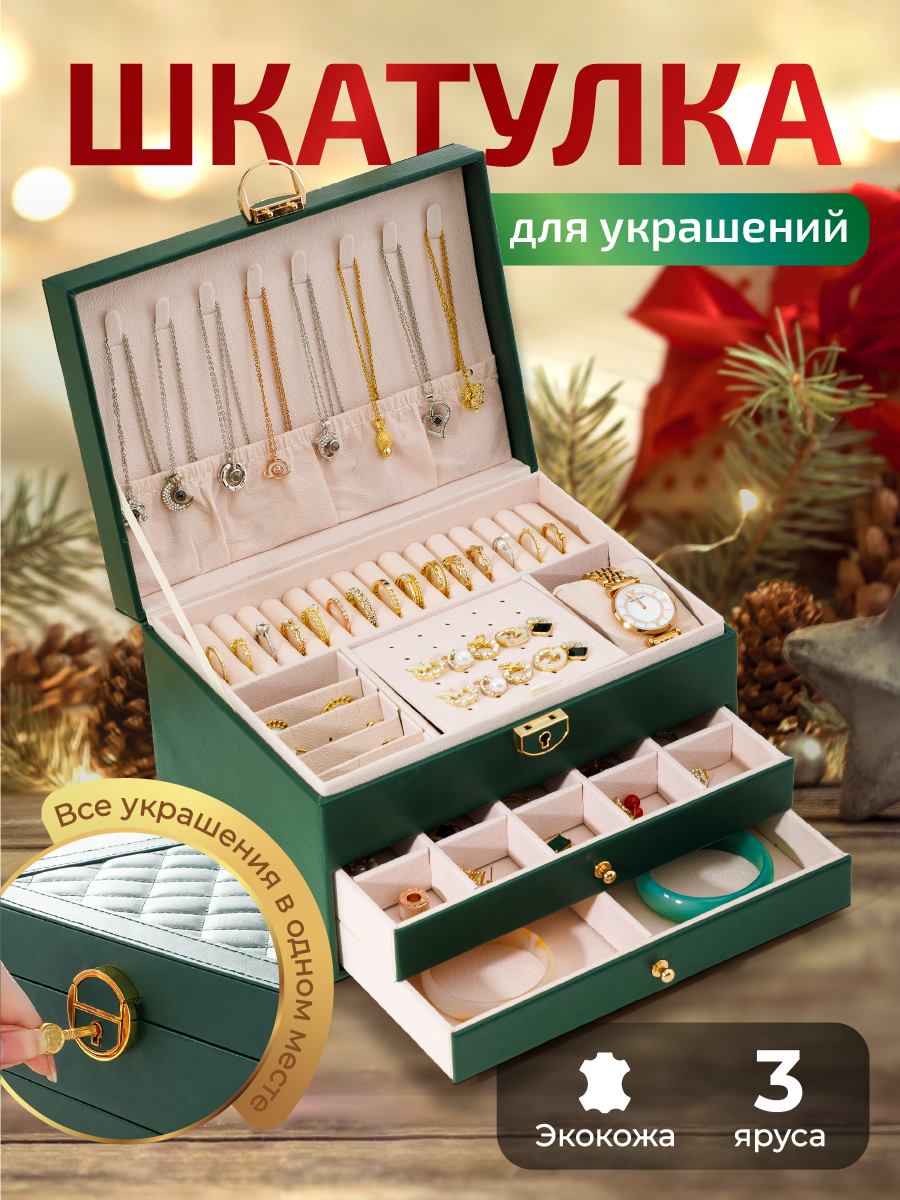 10 цен на Шкатулка для украшений WELHOME 3-х ярусная большая шкатулка с замком, зеленая