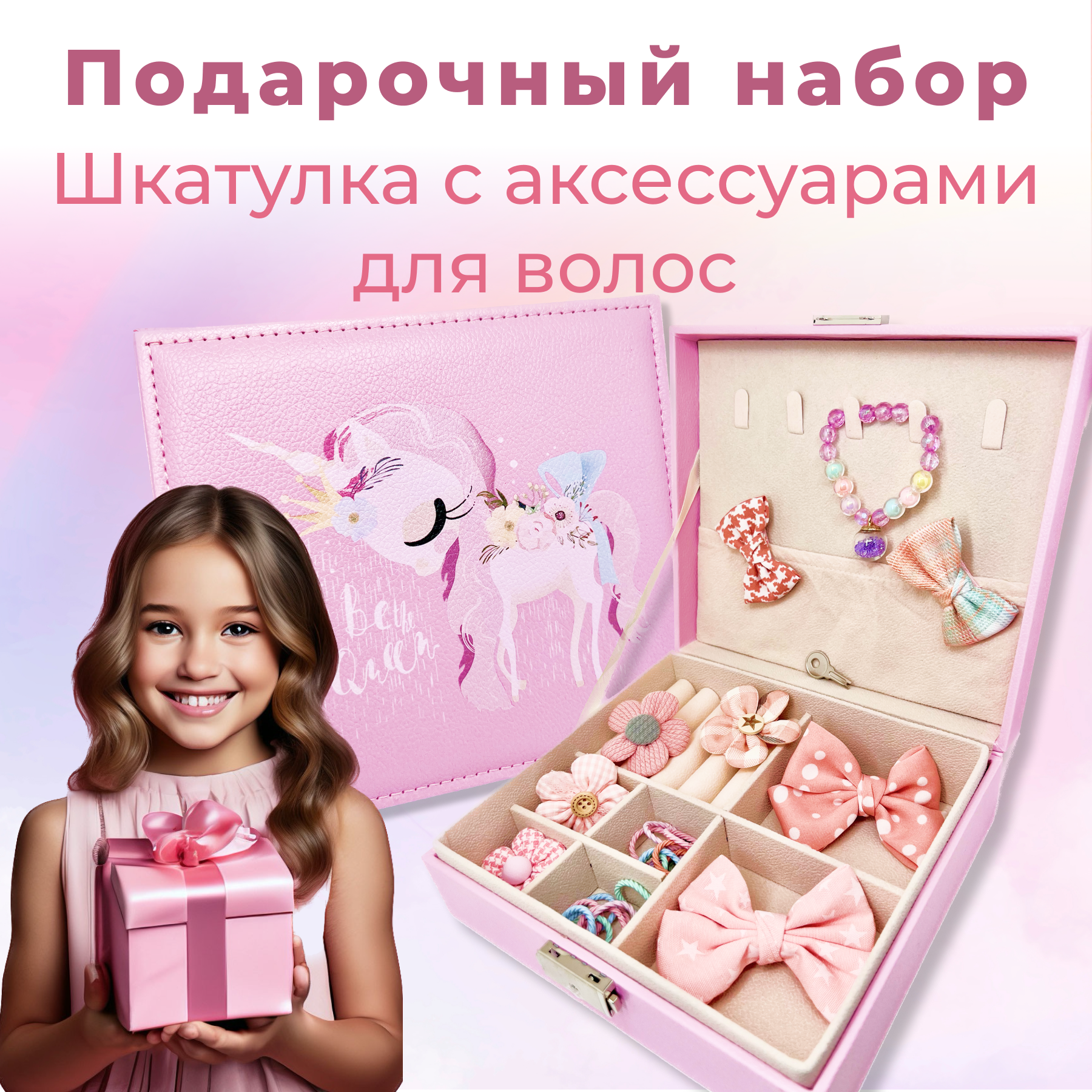 Шкатулка для украшений с аксессуарами для волос и браслетом в подарок для девочки Подарочный Набор на 8 марта, День рождения информация: