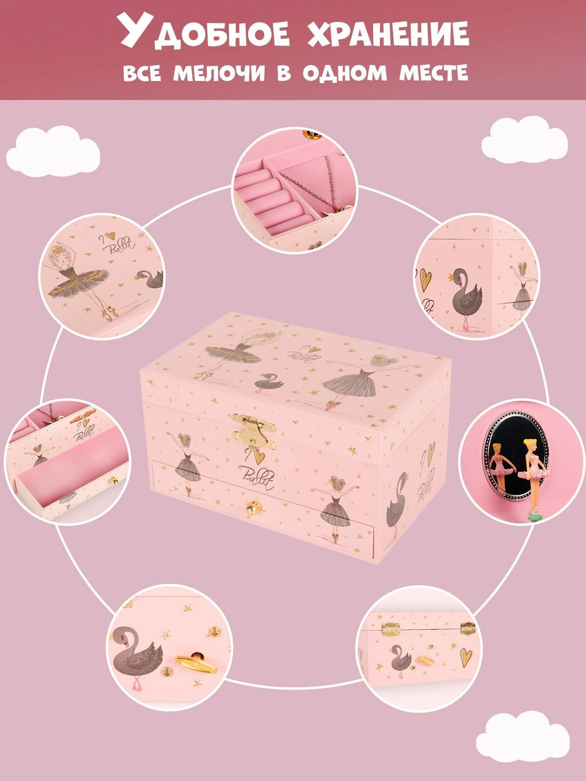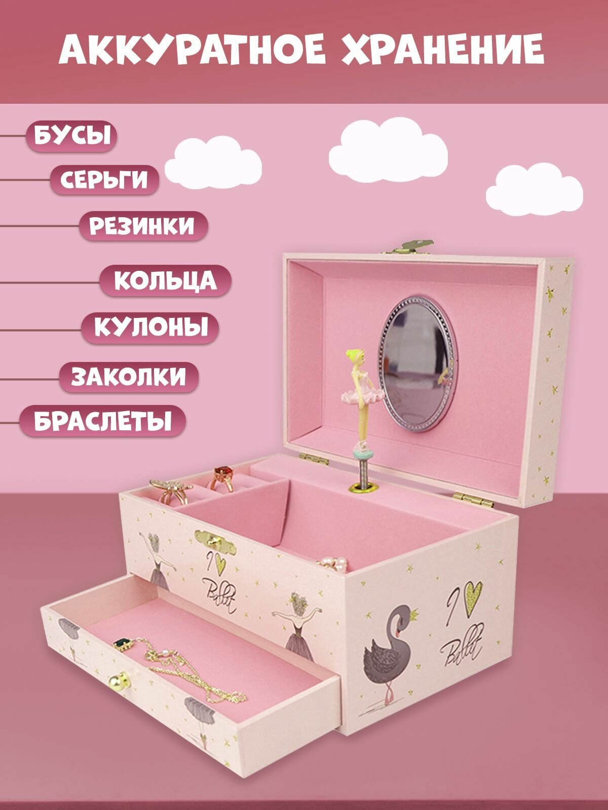 Шкатулка для украшений с зеркалом Remecoclub музыукальная из полимера, 22x12x10 см