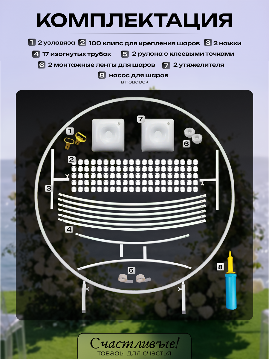 | Подробная комплектация | Изогнутые трубы - 15 шт; ножки - 2 шт; утяжелители - 2 шт; узловязы - 2 шт; рулоны с клеевыми точками - 2 шт; крепления для шаров - 100 шт; монтажные ленты - 2 шт; насос для воздушных шаров - 100 шт |