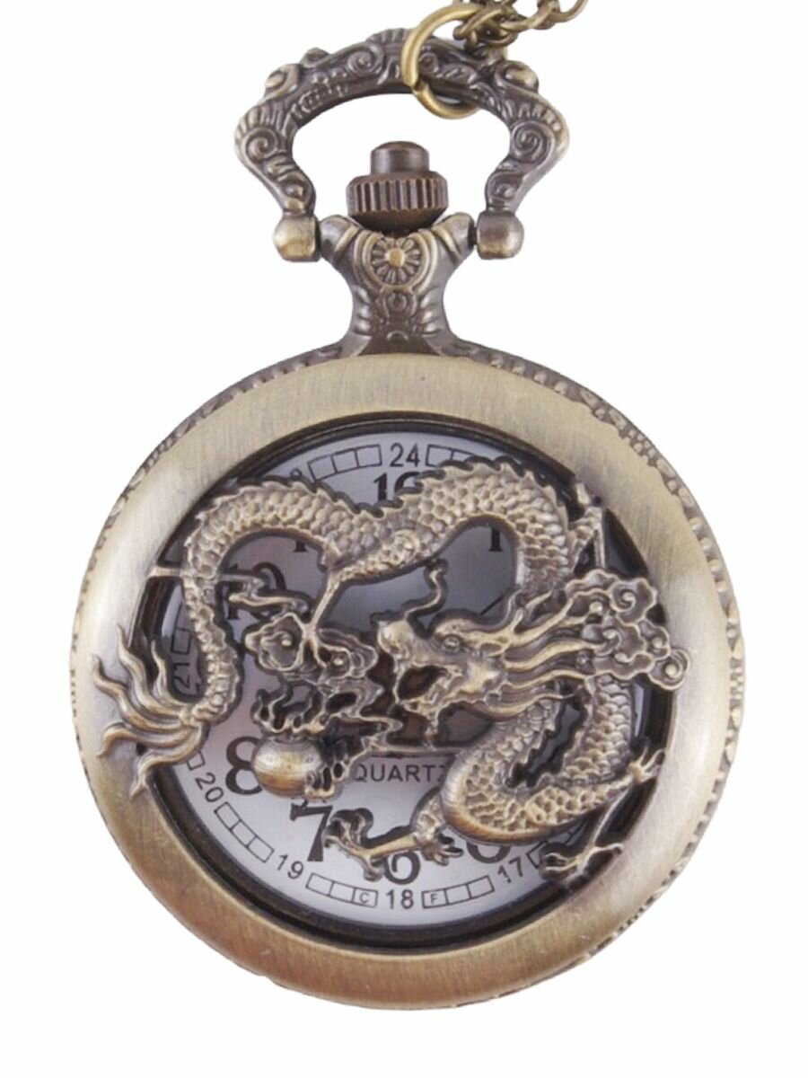 10 цен на Карманные часы цепочке "Дракон". Металл, стекло, гравировка, кварцевый часовой механизм. Конец XX века
