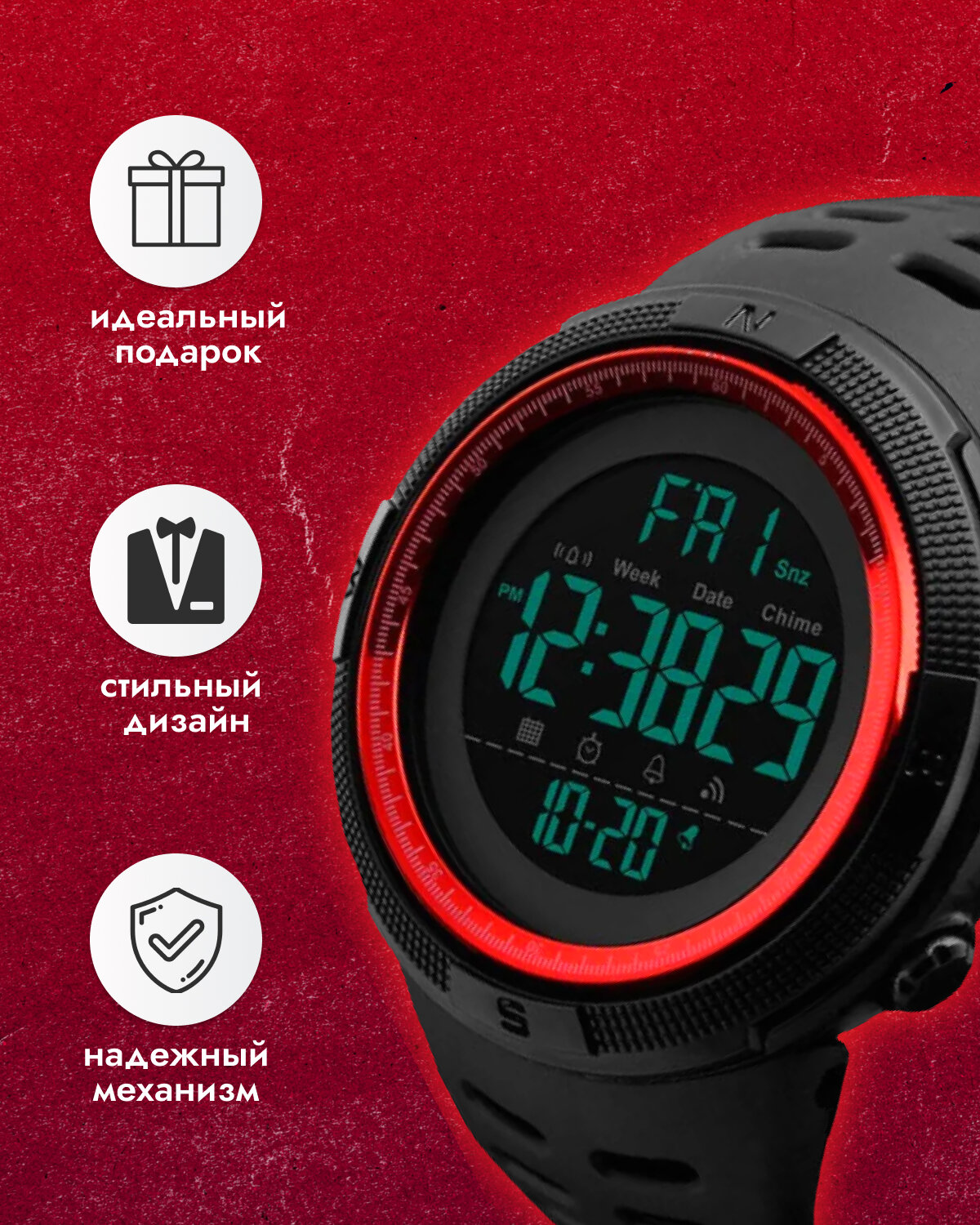 | Дополнительная информация | электронные часы skmei с батарейкой CR2032; спортивнst часы с легким весом; мужские часы отлично для подарка мужчине; женские часы отлично для подарка женщине; часы с таймером для спорта; часы с будильником для путешествий; часы секундомером для туризма; часы с подсветкой в ночное время; часы календарем для планирования праздников; наручные часы черные; стильные часы для повседневности |
