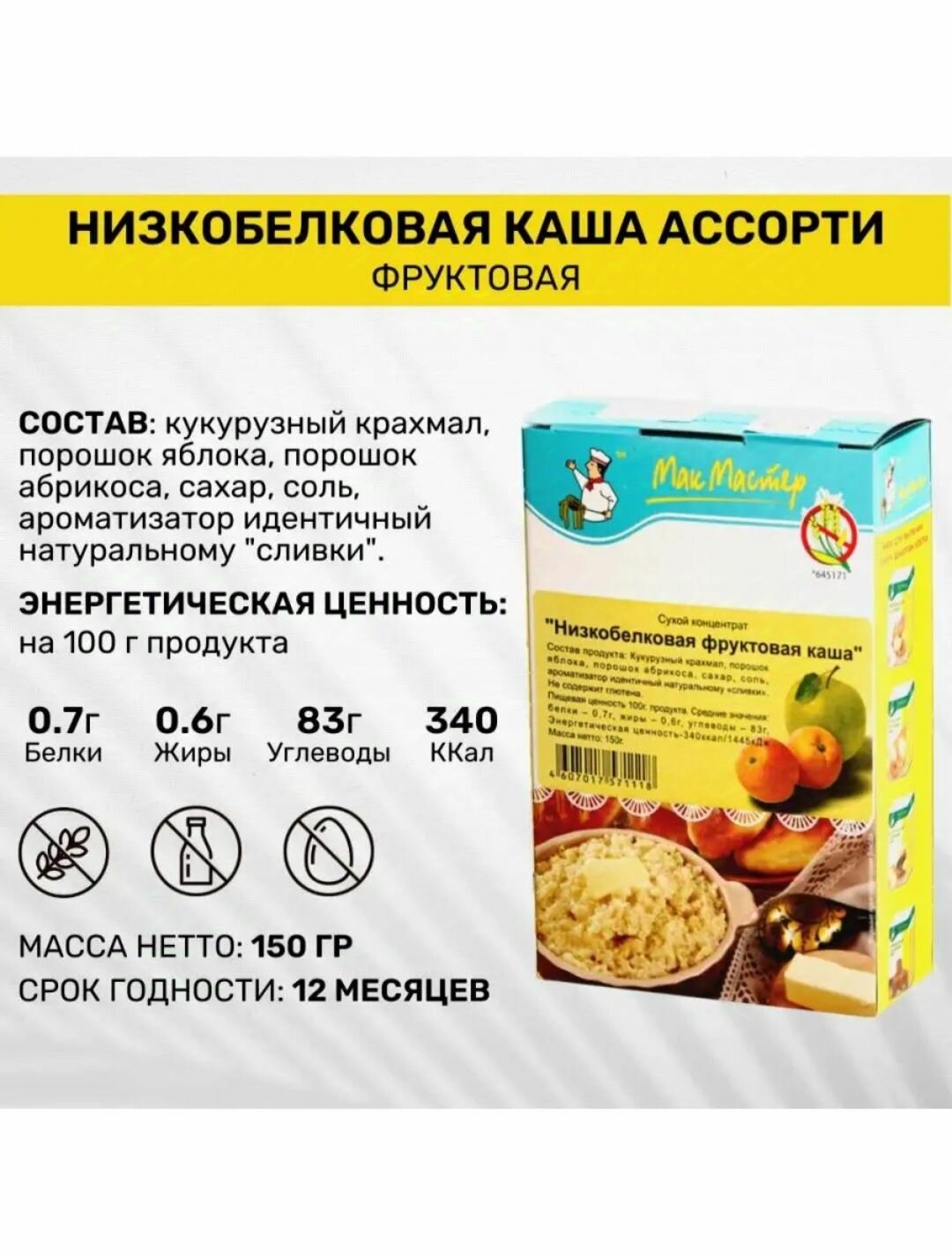 Каша МакМастер без глютена низкобелковая Фруктовая 3 шт по 150г информация: