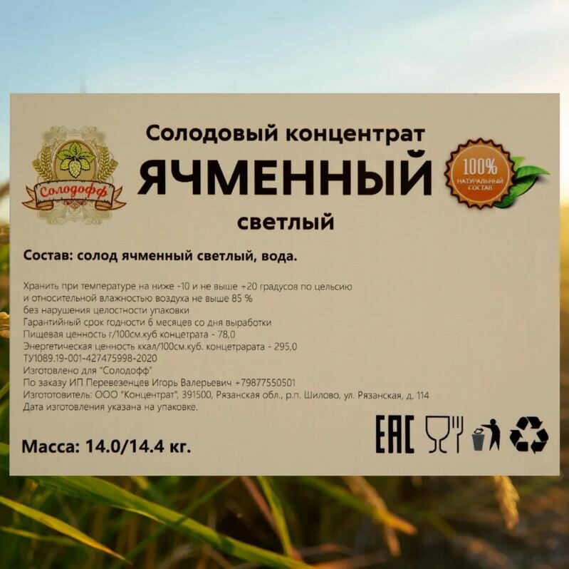 10 цен на Набор №2 Солодовый концентрат ячменный светлый для приготовления Виски, 14 кг