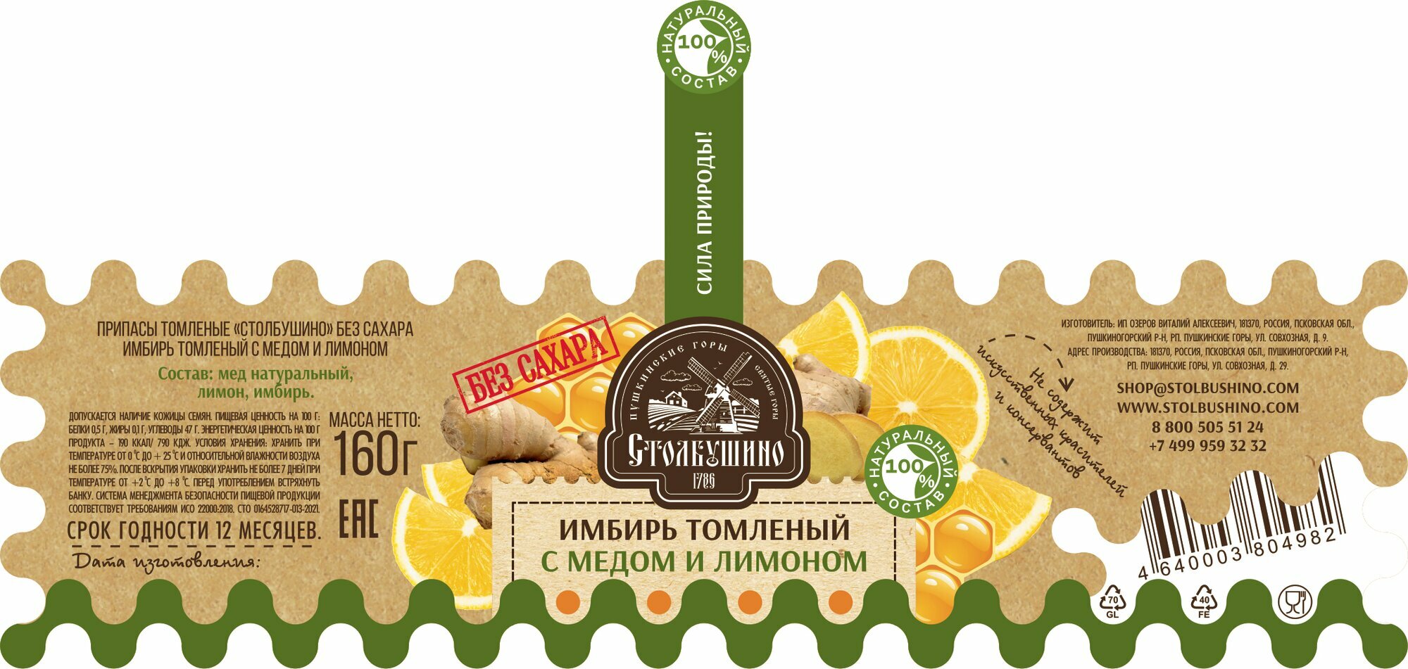 Имбирь томленый с медом и лимоном, без сахара "Столбушино" 160 гр информация: