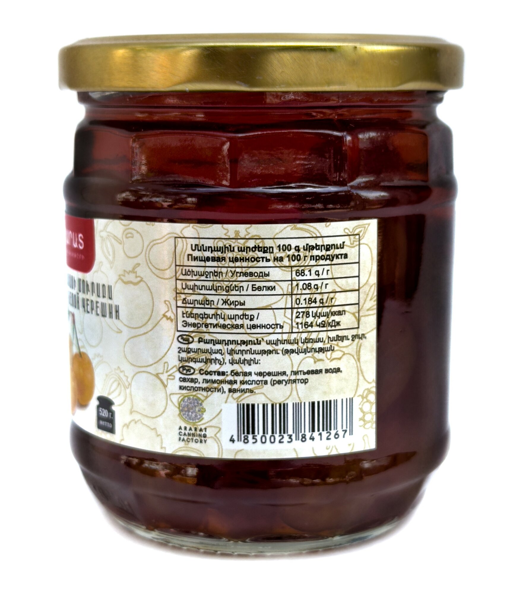 | Состав | белая черешня,питьевая вода, тростниковый сахар, лимонная кислота, ваниль |