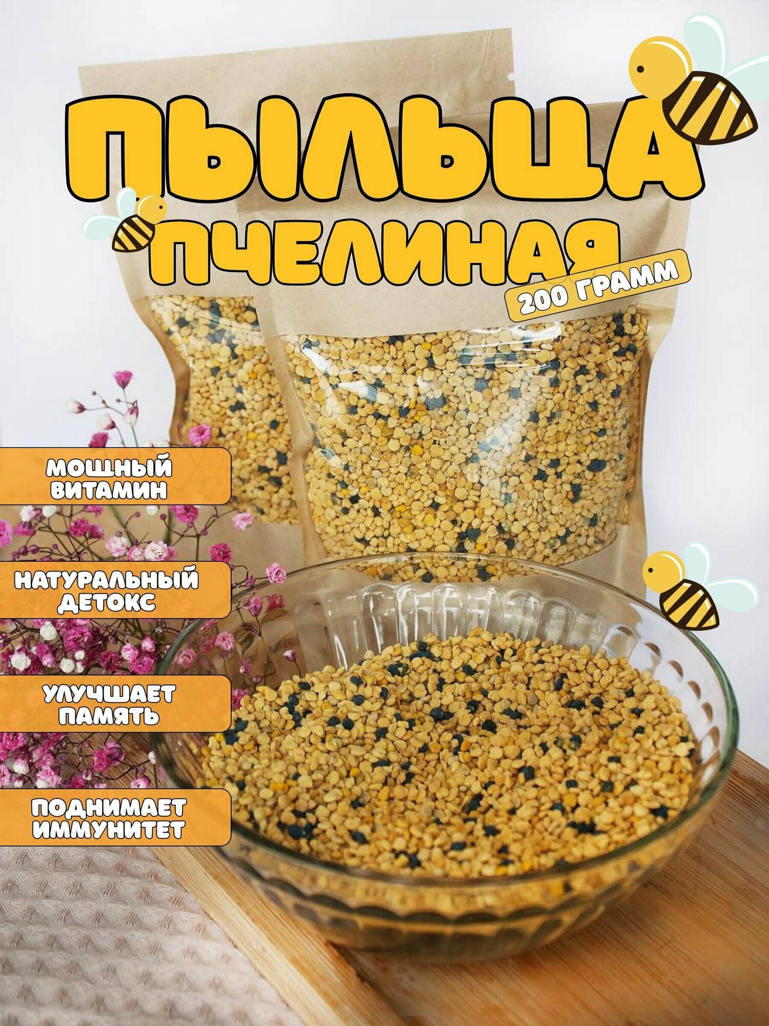 10 цен на Пыльца пчелиная, цветочная пыльца, натуральная 200гр, сбор 2024, витамины