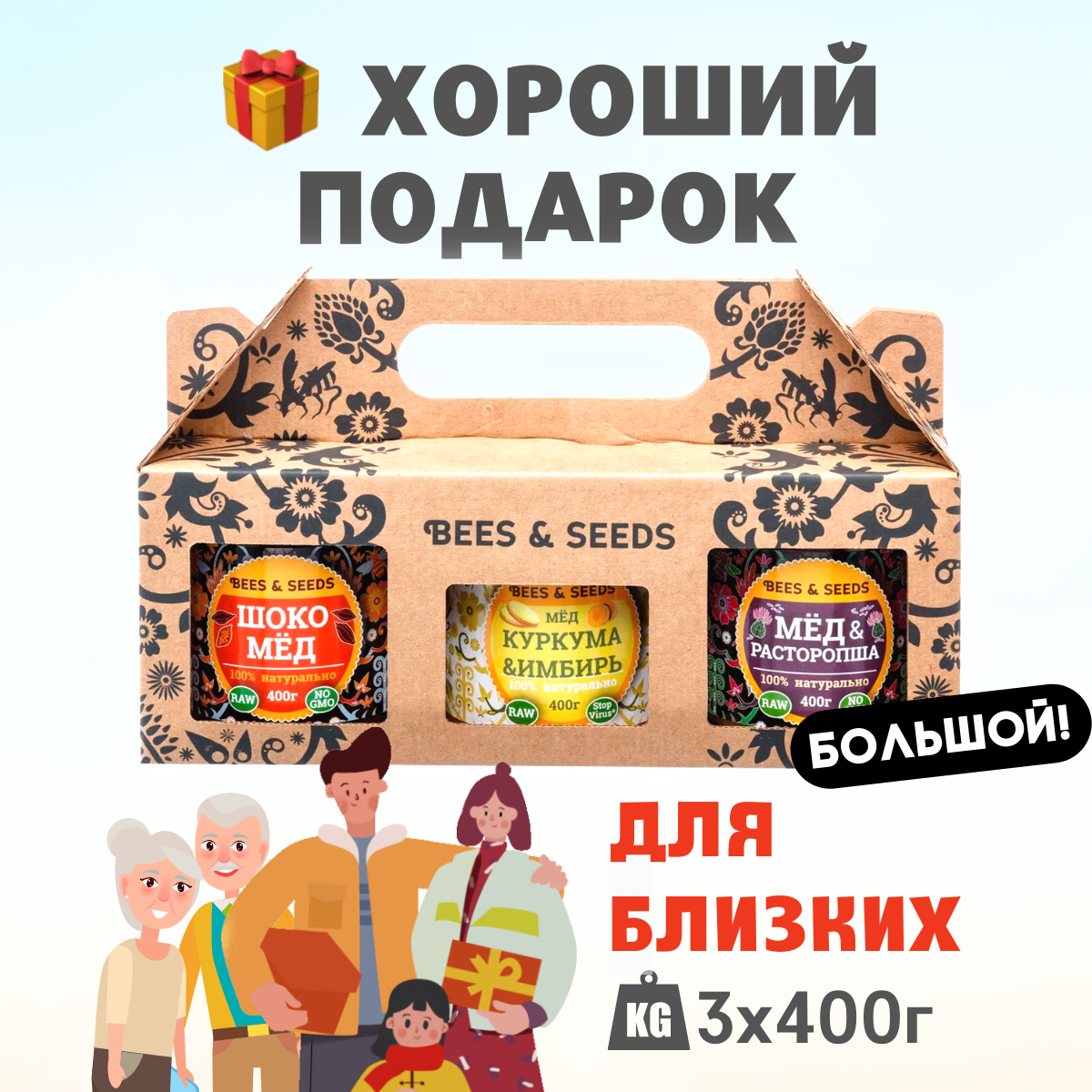 10 цен на Подарочный набор медовых урбечей без сахара "Пчелы и семена" Куркума и Имбирь Расторопша Какао, 3х400 г