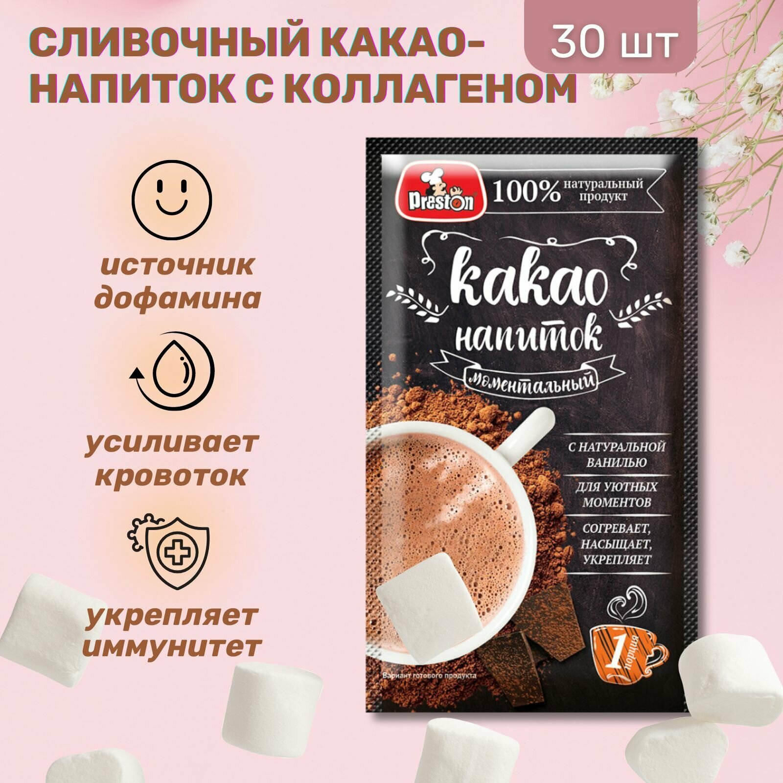 Какао-напиток сливочный с коллагеном Preston 20г., 30 шт. информация: