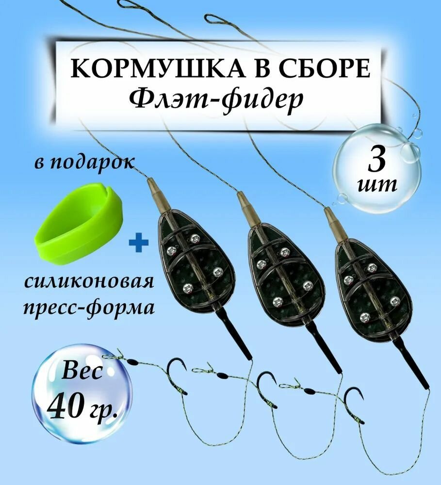 Флэт-фидер снасть на волос в сборе - 40 грамм - 3шт. + пресс-форма / Кормушка для рыбалки / Готовый карповый монтаж Флэт, Донка информация: