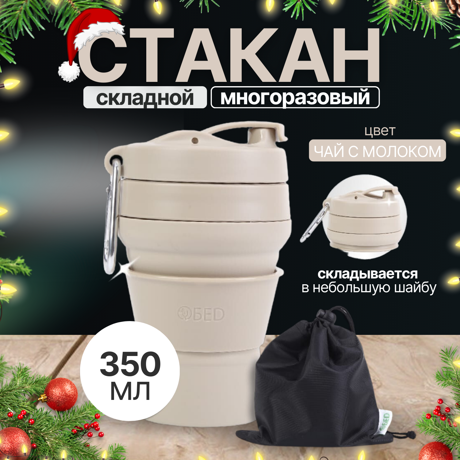 Стакан складной силиконовый c крышкой для кофе многоразовый для воды, чая, с мешочком для хранения, в машину, 350 мл,бежевый, обеd информация: