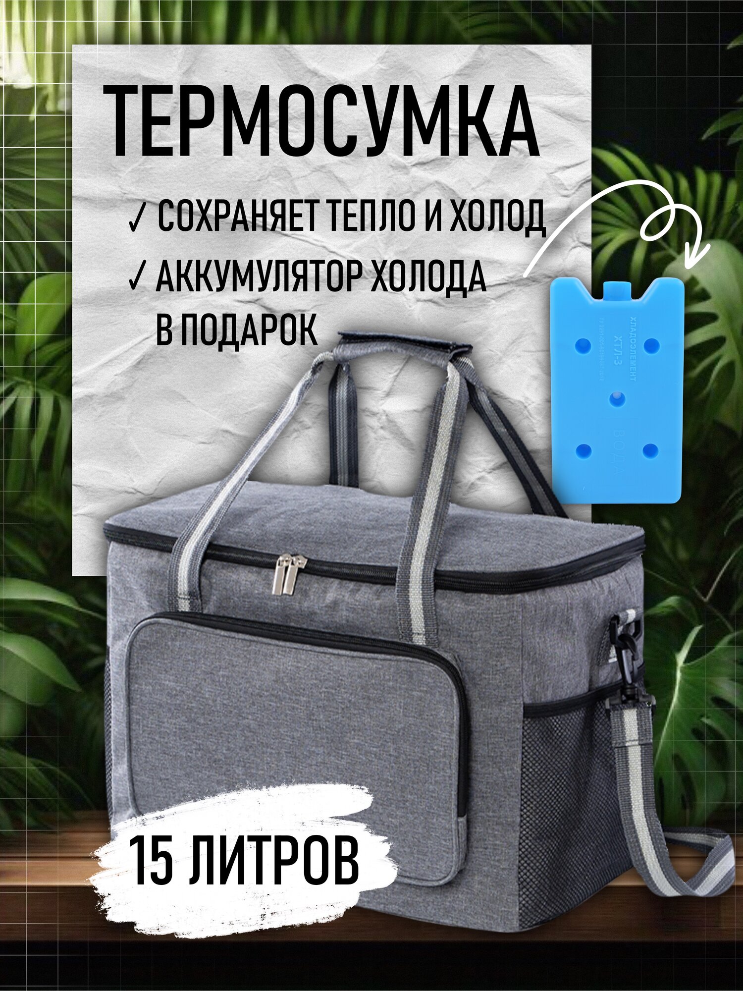 Термосумка холодильник для продуктов и напитков / для ланча (пикника), объем 15 литров, серый + аккумулятор холода информация:
