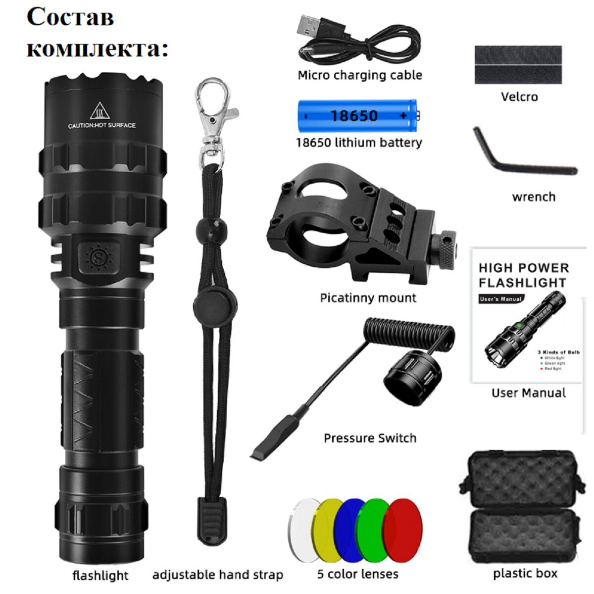 | 4 светофильтра | кнопка дистанционного включения фонаря: крепление на ствол ружья:аккумулятор 18650:шнур USB для зарядки. |