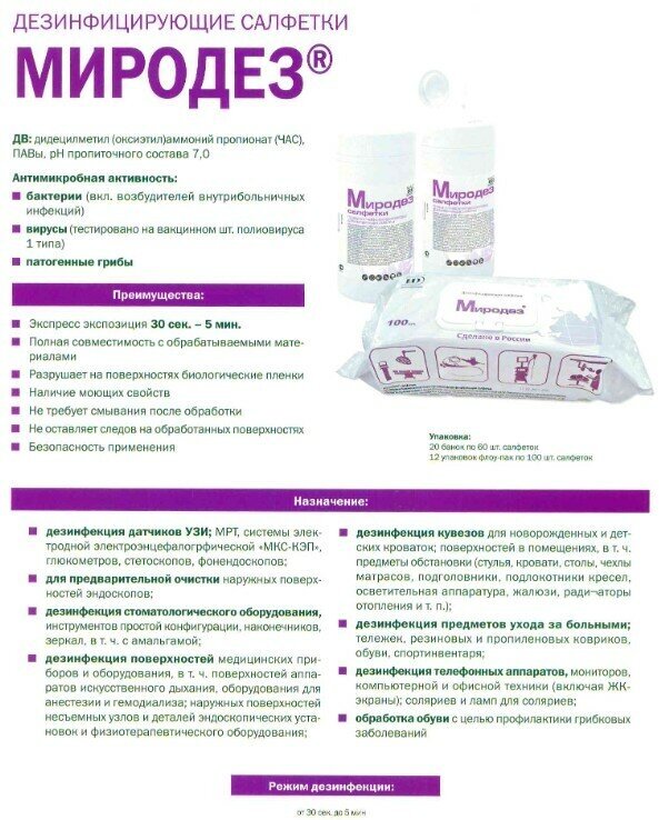 Отзывы на Готовые дезинфицирующие бесспиртовые салфетки Миродез, 100 шт. (190 на 200 мм). Режим дезинфекции: от 30 сек. до 5 мин