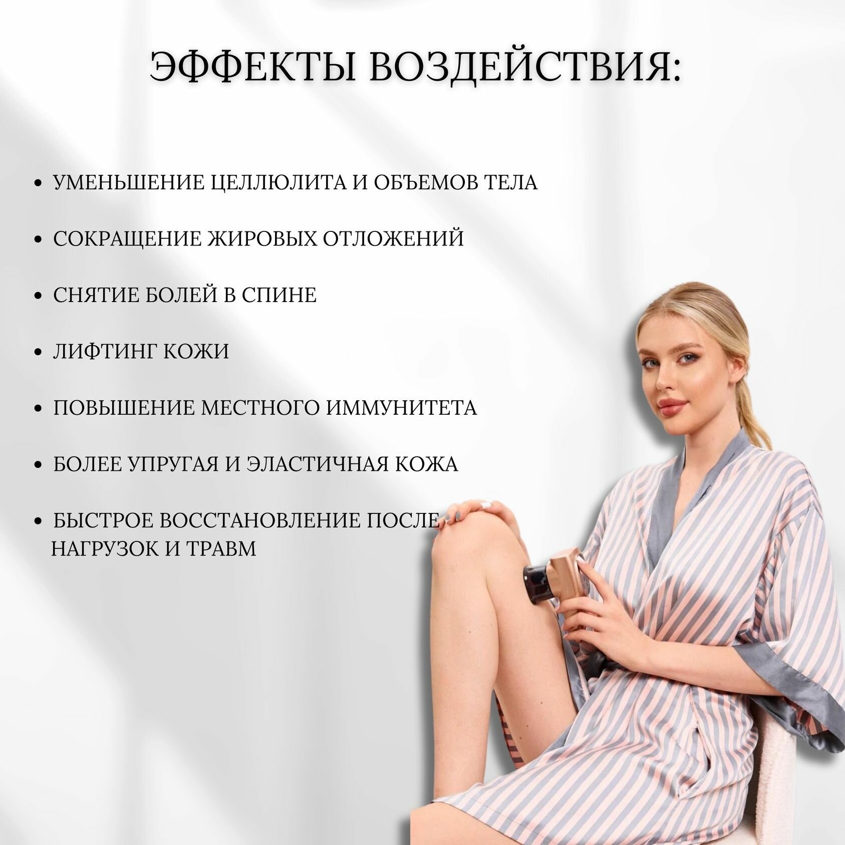 | Результат применения аппарата | Антицеллюлитный, Лимфодренаж, Прогревание, Разглаживание морщин, Шлифовка |