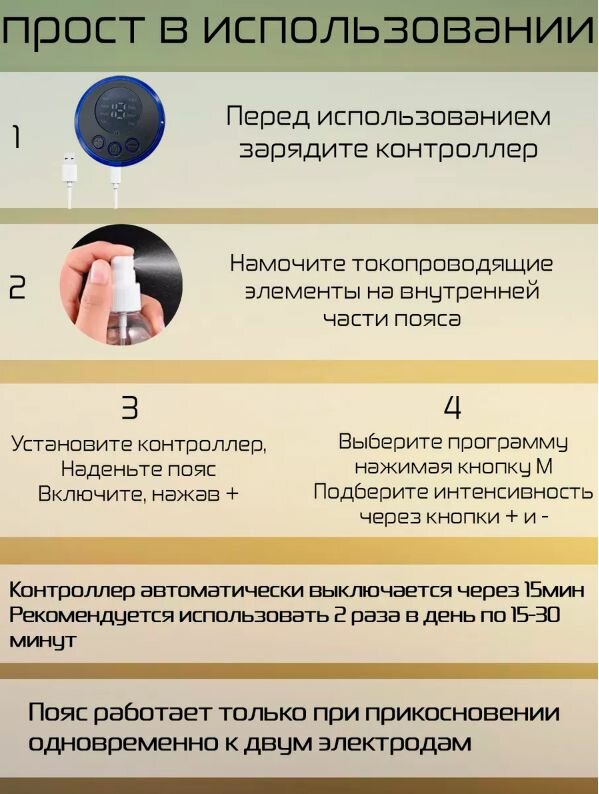 | Способ применения | Во время его работы, вы не испытаете чувства неудобства и можете заниматься важными делами. Результат достигается за счёт электрических импульсов, под воздействием которых происходит сокращение мышц. С зарядкой от USB. Поможет снять напряжение практически с любой зоны, части тела. |